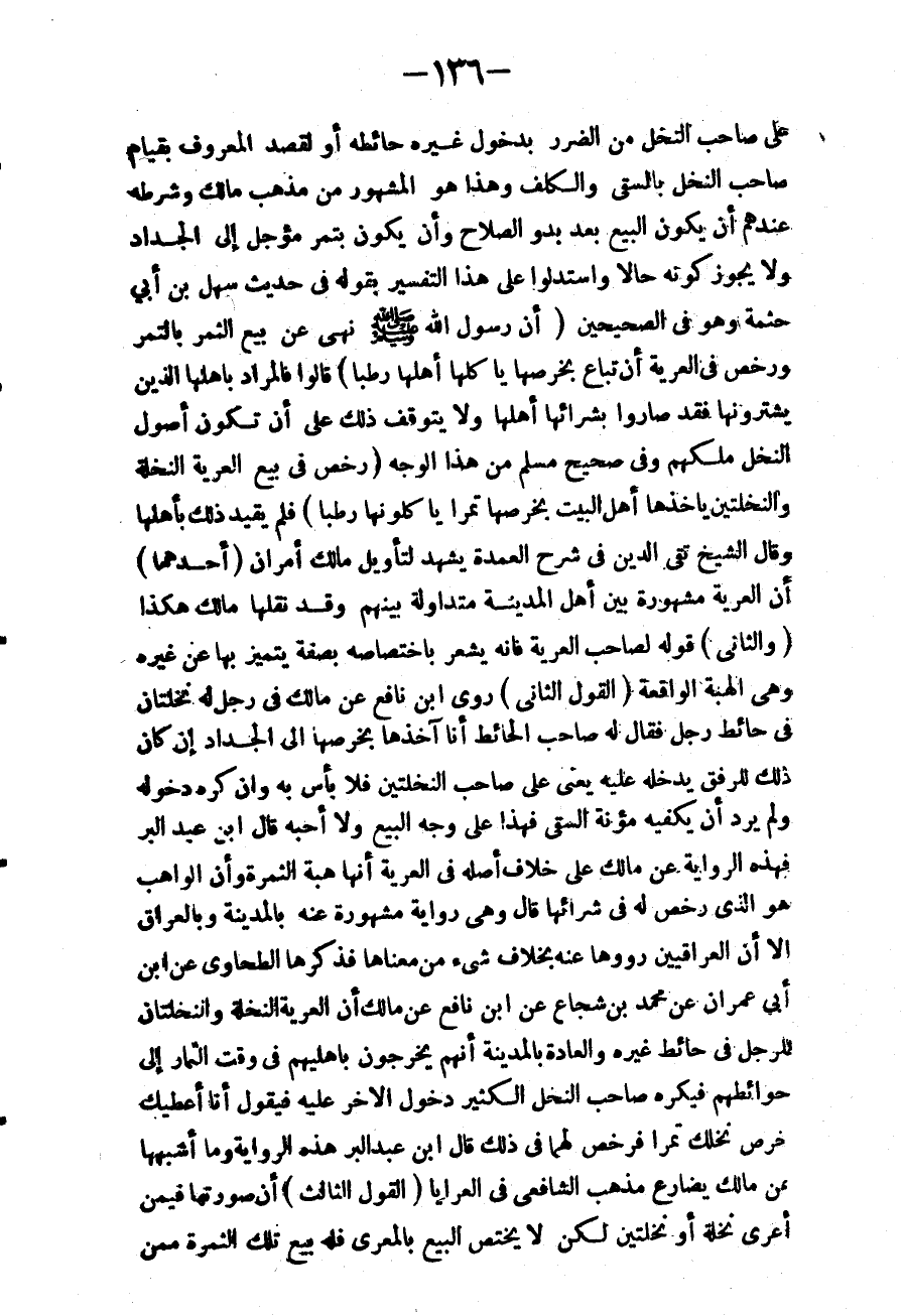 ـــــــــــــــــــــــــــــQعَلَى صَاحِبِ النَّخْلِ مِنْ الضَّرَرِ بِدُخُولِ غَيْرِهِ حَائِطَهُ أَوْ لِقَصْدِ الْمَعْرُوفِ بِقِيَامِ صَاحِبِ النَّخْلِ بِالسَّقْيِ وَالْكُلَفِ وَهَذَا هُوَ الْمَشْهُورُ مِنْ مَذْهَبِ مَالِكٍ وَشَرْطُهُ عِنْدَهُمْ أَنْ يَكُونَ الْبَيْعُ بَعْدَ بُدُوِّ الصَّلَاحِ، وَأَنْ يَكُونَ بِتَمْرٍ مُؤَجَّلٍ إلَى الْجِدَادِ وَلَا يَجُوزُ كَوْنُهُ حَالًّا وَاسْتَدَلُّوا عَلَى هَذَا التَّفْسِيرِ بِقَوْلِهِ فِي حَدِيثِ سَهْلِ بْنِ أَبِي حَثْمَةَ وَهُوَ فِي الصَّحِيحَيْنِ «أَنَّ رَسُولَ اللَّهِ - صَلَّى اللَّهُ عَلَيْهِ وَسَلَّمَ - نَهَى عَنْ بَيْعِ الثَّمَرِ بِالتَّمْرِ وَرَخَّصَ فِي الْعَرِيَّةِ أَنْ تُبَاعَ بِخَرْصِهَا يَأْكُلُهَا أَهْلُهَا رُطَبًا» . قَالُوا: فَالْمُرَادُ بِأَهْلِهَا الَّذِينَ يَشْتَرُونَهَا فَقَدْ صَارُوا بِشِرَائِهَا أَهْلَهَا وَلَا يَتَوَقَّفُ ذَلِكَ عَلَى أَنْ تَكُونَ أُصُولُ النَّخْلِ مِلْكَهُمْ وَفِي صَحِيحِ مُسْلِمٍ مِنْ هَذَا الْوَجْهِ (رَخَّصَ فِي بَيْعِ الْعَرِيَّةِ النَّخْلَةِ وَالنَّخْلَتَيْنِ يَأْخُذُهَا أَهْلُ الْبَيْتِ بِخَرْصِهَا تَمْرًا يَأْكُلُونَهَا رُطَبًا) فَلَمْ يُقَيِّدْ ذَلِكَ بِأَهْلِهَا.