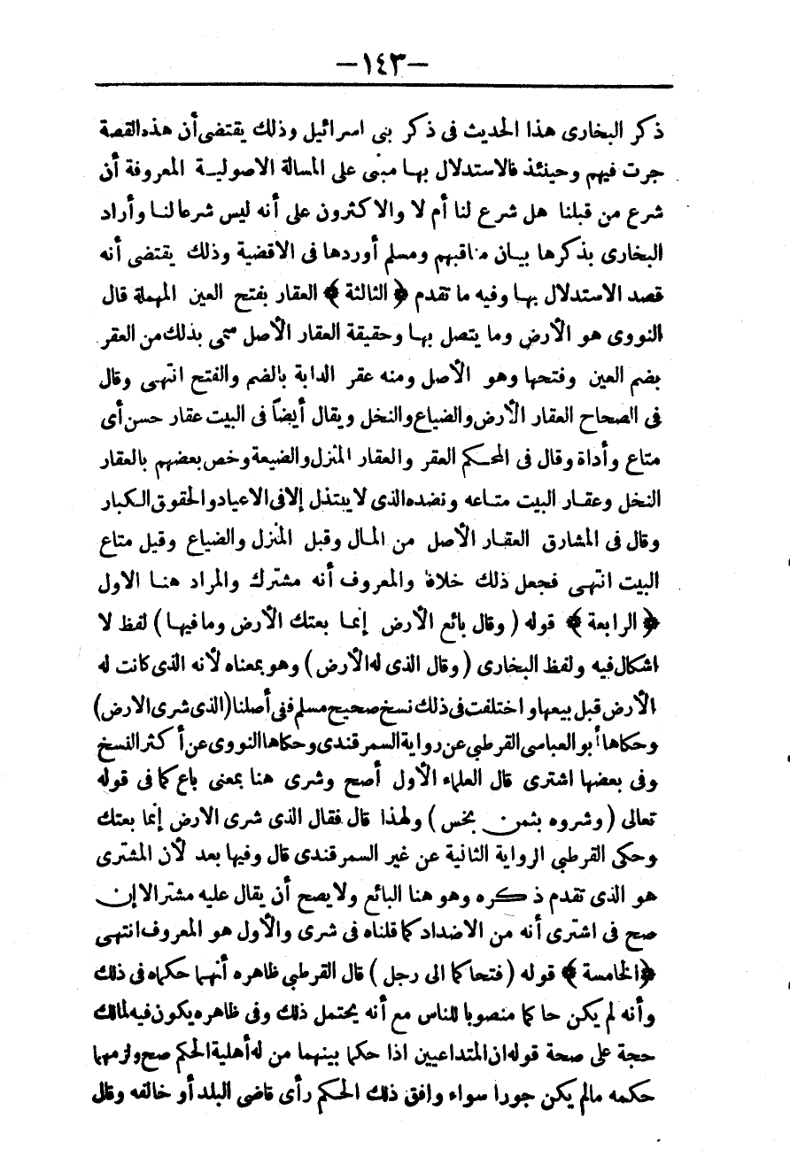ـــــــــــــــــــــــــــــQذَكَرَ الْبُخَارِيُّ هَذَا الْحَدِيثَ فِي ذِكْرِ بَنِي إسْرَائِيلَ وَذَلِكَ يَقْتَضِي أَنَّ هَذِهِ الْقِصَّةَ جَرَتْ فِيهِمْ وَحِينَئِذٍ فَالِاسْتِدْلَالُ بِهَا مَبْنِيٌّ عَلَى الْمَسْأَلَةِ الْأُصُولِيَّةِ الْمَعْرُوفَةِ أَنَّ شَرْعَ مَنْ قَبْلَنَا هَلْ شَرْعٌ لَنَا أَمْ لَا وَالْأَكْثَرُونَ عَلَى أَنَّهُ لَيْسَ شَرْعًا لَنَا وَأَرَادَ الْبُخَارِيُّ بِذِكْرِهَا بَيَانَ مَنَاقِبِهِمْ وَمُسْلِمٌ أَوْرَدَهَا فِي الْأَقْضِيَةِ وَذَلِكَ يَقْتَضِي أَنَّهُ قَصَدَ الِاسْتِدْلَالَ بِهَا وَفِيهِ مَا تَقَدَّمَ. {الثَّالِثَةُ} الْعَقَارُ بِفَتْحِ الْعَيْنِ الْمُهْمَلَةِ قَالَ النَّوَوِيُّ هُوَ الْأَرْضُ وَمَا يَتَّصِلُ بِهَا وَحَقِيقَةُ الْعَقَارِ الْأَصْلُ سُمِّيَ بِذَلِكَ مِنْ الْعُقْرِ بِضَمِّ الْعَيْنِ وَفَتْحِهَا وَهُوَ الْأَصْلُ وَمِنْهُ عُقْرُ الدَّابَّةِ بِالضَّمِّ وَالْفَتْحِ. انْتَهَى.