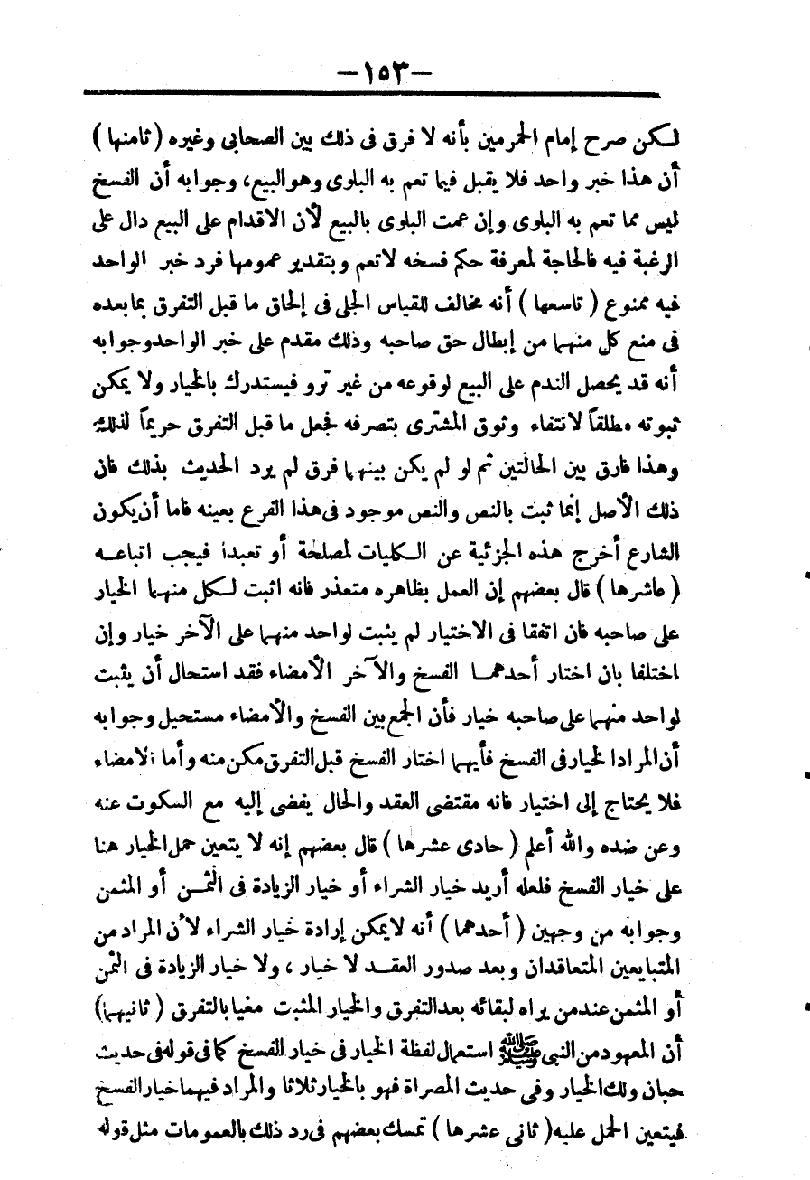 (ثَامِنُهَا) أَنَّ هَذَا خَبَرٌ وَاحِدٌ فَلَا يُقْبَلُ فِيمَا تَعُمُّ بِهِ الْبَلْوَى وَهُوَ الْبَيْعُ. وَجَوَابُهُ: أَنَّ الْفَسْخَ لَيْسَ مِمَّا تَعُمُّ بِهِ الْبَلْوَى، وَإِنْ عَمَّتْ الْبَلْوَى بِالْبَيْعِ؛ لِأَنَّ الْإِقْدَامَ عَلَى الْبَيْعِ دَالٌّ عَلَى الرَّغْبَةِ فِيهِ فَالْحَاجَةُ لِمَعْرِفَةِ حُكْمِ فَسْخِهِ لَا تَعُمُّ وَبِتَقْدِيرِ عُمُومِهَا فَرَدُّ خَبَرِ الْوَاحِدِ فِيهِ مَمْنُوعٌ. (تَاسِعُهَا) أَنَّهُ مُخَالِفٌ لِلْقِيَاسِ الْجَلِيِّ فِي إلْحَاقِ مَا قَبْلَ التَّفَرُّقِ بِمَا بَعْدَهُ فِي مَنْعِ كُلٍّ مِنْهُمَا مِنْ إبْطَالِ حَقِّ صَاحِبِهِ وَذَلِكَ مُقَدَّمٌ عَلَى خَبَرِ الْوَاحِدِ وَجَوَابُهُ أَنَّهُ قَدْ يَحْصُلُ النَّدَمُ عَلَى الْبَيْعِ لِوُقُوعِهِ مِنْ غَيْرِ تَرَوٍّ فَيُسْتَدْرَكُ بِالْخِيَارِ، وَلَا يُمْكِنُ ثُبُوتُهُ مُطْلَقًا لِانْتِفَاءِ وُثُوقِ الْمُشْتَرِي بِتَصَرُّفِهِ فَجُعِلَ مَا قَبْلَ التَّفَرُّقِ حَرِيمًا لِذَلِكَ وَهَذَا فَارِقٌ بَيْنَ الْحَالَتَيْنِ ثُمَّ لَوْ لَمْ يَكُنْ بَيْنَهُمَا فَرْقٌ لَمْ يَرِدْ الْحَدِيثُ بِذَلِكَ فَإِنَّ ذَلِكَ الْأَصْلَ إنَّمَا ثَبَتَ بِالنَّصِّ، وَالنَّصُّ مَوْجُودٌ فِي هَذَا الْفَرْعِ بِعَيْنِهِ فَإِمَّا أَنْ يَكُونَ الشَّارِعُ أَخْرَجَ هَذِهِ الْجُزْئِيَّةَ عَنْ الْكُلِّيَّاتِ لِمَصْلَحَةٍ أَوْ تَعَبُّدًا فَيَجِبُ اتِّبَاعُهُ.