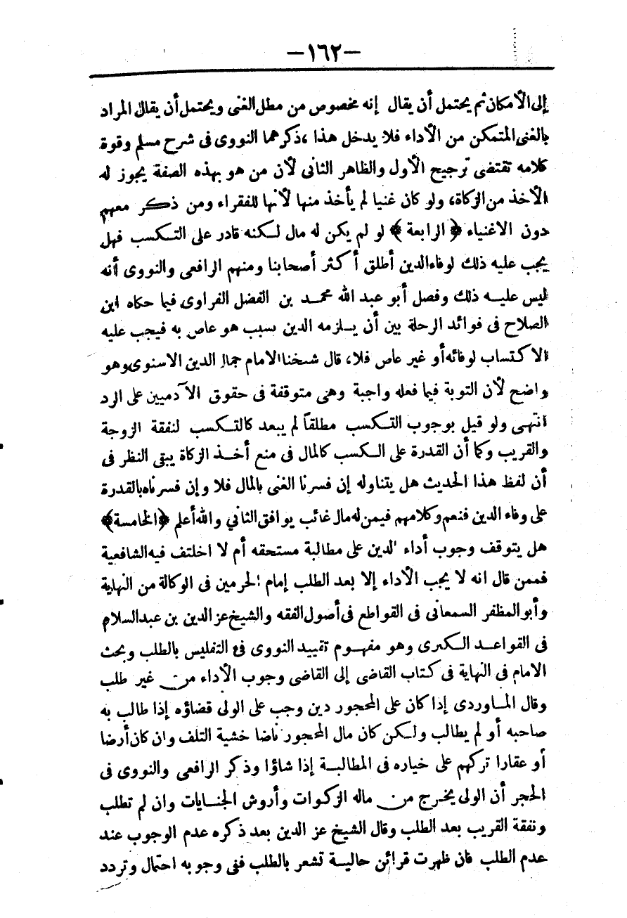 (الْخَامِسَةُ) هَلْ يَتَوَقَّفُ وُجُوبُ أَدَاءِ الدَّيْنِ عَلَى مُطَالَبَةِ مُسْتَحِقِّهِ أَمْ لَا اخْتَلَفَ فِيهِ الشَّافِعِيَّةُ فَمِمَّنْ قَالَ: إنَّهُ لَا يَجِبُ الْأَدَاءُ إلَّا بَعْدَ الطَّلَبِ إمَامُ الْحَرَمَيْنِ فِي الْوَكَالَةِ مِنْ النِّهَايَةِ وَأَبُو الْمُظَفَّرِ السَّمْعَانِيُّ فِي الْقَوَاطِعِ فِي أُصُولِ الْفِقْهِ وَالشَّيْخُ عِزُّ الدِّينِ بْنُ عَبْدِ السَّلَامِ فِي الْقَوَاعِدِ الْكُبْرَى وَهُوَ مَفْهُومُ تَقْيِيدِ النَّوَوِيِّ فِي التَّفْلِيسِ بِالطَّلَبِ وَبَحَثَ الْإِمَامُ فِي النِّهَايَةِ فِي كِتَابِ الْقَاضِي وُجُوبَ الْأَدَاءِ مِنْ غَيْرِ طَلَبٍ، وَقَالَ الْمَاوَرْدِيُّ: إذَا كَانَ عَلَى الْمَحْجُورِ دَيْنٌ وَجَبَ عَلَى الْوَلِيِّ قَضَاؤُهُ إذَا طَالَبَ بِهِ صَاحِبُهُ أَوْ لَمْ يُطَالِبْ، وَلَكِنْ كَانَ مَالُ الْمَحْجُورِ نَاضًّا خَشْيَةَ التَّلَفِ، وَإِنْ كَانَ أَرْضًا أَوْ عَقَارًا تَرَكَهُمْ عَلَى خِيَارِهِ فِي الْمُطَالَبَةِ إذَا شَاءُوا وَذَكَرَ الرَّافِعِيُّ وَالنَّوَوِيُّ فِي الْحَجْرِ أَنَّ الْوَلِيَّ يُخْرِجُ مِنْ مَالِهِ الزَّكَوَاتِ وَأُرُوشَ الْجِنَايَاتِ، وَإِنْ لَمْ تُطْلَبْ وَنَفَقَةَ الْقَرِيبِ بَعْدَ الطَّلَبِ وَقَالَ الشَّيْخُ عِزُّ الدِّينِ بَعْدَ ذِكْرِهِ عَدَمَ الْوُجُوبِ عِنْدَ عَدَمِ الطَّلَبِ: فَإِنْ ظَهَرَتْ قَرَائِنُ حَالِيَّةٌ تُشْعِرُ بِالطَّلَبِ فَفِي وُجُوبِهِ احْتِمَالٌ وَتَرَدُّدٌ