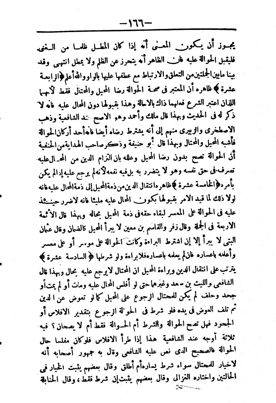 (الرَّابِعَةَ عَشْرَةَ) ظَاهِرُهُ أَنَّ الْمُعْتَبَرَ فِي صِحَّةِ الْحَوَالَةِ رِضَا الْمُحِيلِ وَالْمُحْتَالِ فَقَطْ؛ لِأَنَّهُمَا اللَّذَانِ اعْتَبَرَ الشَّرْعُ فِعْلَهُمَا ذَاكَ بِالْإِحَالَةِ، وَهَذَا بِقَبُولِهَا دُونَ الْمُحَالِ عَلَيْهِ فَإِنَّهُ لَا ذِكْرَ لَهُ فِي الْحَدِيثِ، وَبِهَذَا قَالَ مَالِكٌ وَأَحْمَدُ وَهُوَ الْأَصَحُّ عِنْدَ الشَّافِعِيَّةِ وَذَهَبَ الْإِصْطَخْرِيُّ وَالزُّبَيْرِيُّ مِنْهُمْ إلَى أَنَّهُ يُشْتَرَطُ رِضَاهُ أَيْضًا فَإِنَّهُ أَحَدُ أَرْكَانِ الْحَوَالَةِ فَأَشْبَهَ الْمُحِيلَ وَالْمُحْتَالَ وَبِهَذَا قَالَ أَبُو حَنِيفَةَ وَذَكَرَ صَاحِبُ الْهِدَايَةِ مِنْ الْحَنَفِيَّةِ أَنَّ الْحَوَالَةَ تَصِحُّ بِدُونِ رِضَا الْمُحِيلِ وَعَلَّلَهُ بِأَنَّ الْتِزَامَ الدَّيْنِ مِنْ الْمُحَالِ عَلَيْهِ تَصَرُّفُ فِي حَقِّ نَفْسِهِ وَهُوَ لَا يَتَضَرَّرُ بِهِ بَلْ فِيهِ نَفْعُهُ؛ لِأَنَّهُ لَمْ يَرْجِعْ عَلَيْهِ إذَا لَمْ يَكُنْ بِأَمْرِهِ.