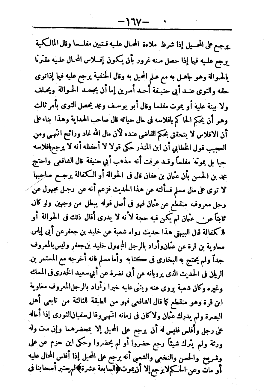 وَمِنْ الْعَجِيبِ قَوْلُ الْخَطَّابِيِّ أَنَّ ابْنَ الْمُنْذِرِ حَكَى قَوْلًا لَا أَحْفَظُهُ أَنَّهُ لَا يَرْجِعُ بِإِفْلَاسِهِ حَيًّا بَلْ بِمَوْتِهِ مُفْلِسًا وَقَدْ عَرَفْت أَنَّهُ مَذْهَبُ أَبِي حَنِيفَةَ قَالَ الشَّافِعِيُّ: وَاحْتَجَّ مُحَمَّدُ بْنُ الْحَسَنِ بِأَنَّ عُثْمَانَ بْنَ عَفَّانَ قَالَ فِي الْحَوَالَةِ أَوْ الْكَفَالَةِ يَرْجِعُ صَاحِبُهَا لَا تَوَى عَلَى مَالِ مُسْلِمٍ فَسَأَلْتُهُ عَنْ هَذَا الْحَدِيثِ فَزَعَمَ أَنَّهُ عَنْ رَجُلٍ مَجْهُولٍ عَنْ رَجُلٍ مَعْرُوفٍ مُنْقَطِعٍ عَنْ عُثْمَانَ فَهُوَ فِي أَصْلِ قَوْلِهِ يَبْطُلُ مِنْ وَجْهَيْنِ، وَلَوْ كَانَ ثَابِتًا عَنْ عُثْمَانَ لَمْ يَكُنْ فِيهِ حُجَّةٌ؛ لِأَنَّهُ لَا يَدْرِي أَقَالَ ذَلِكَ فِي الْحَوَالَةِ أَوْ الْكَفَالَةِ قَالَ الْبَيْهَقِيُّ هَذَا حَدِيثٌ رَوَاهُ شُعْبَةُ عَنْ خُلَيْدِ بْنِ جَعْفَرٍ عَنْ أَبِي إيَاسٍ مُعَاوِيَةَ بْنِ قُرَّةَ عَنْ عُثْمَانَ وَأَرَادَ بِالرَّجُلِ الْمَجْهُولِ خُلَيْدُ بْنَ جَعْفَرٍ وَلَيْسَ بِالْمَعْرُوفِ جِدًّا وَلَمْ يَحْتَجَّ بِهِ الْبُخَارِيُّ فِي كِتَابِهِ.