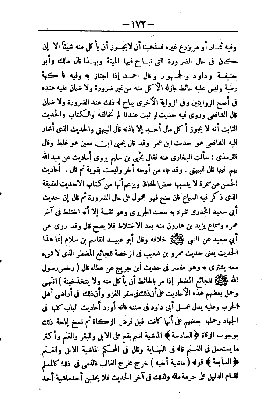 قَالَ الْبَيْهَقِيُّ: وَقَدْ جَاءَ مِنْ أَوْجُهٍ أُخُرَ وَلَيْسَتْ بِقَوِيَّةٍ ثُمَّ قَالَ: أَحَادِيثُ الْحَسَنِ عَنْ سَمُرَةَ لَا يَنْسُبُهَا بَعْضُ الْحُفَّاظِ وَيَزْعُمُ أَنَّهَا مِنْ كِتَابٍ إلَّا حَدِيثَ الْعَقِيقَةِ الَّذِي ذَكَرَ فِيهِ السَّمَاعَ فَإِنْ صَحَّ فَهُوَ مَحْمُولٌ عَلَى حَالِ الضَّرُورَةِ ثُمَّ قَالَ: إنَّ حَدِيثَ أَبِي سَعِيدٍ الْخُدْرِيِّ تَفَرَّدَ بِهِ سَعِيدٌ الْجَرِيرِيُّ وَهُوَ ثِقَةٌ إلَّا أَنَّهُ اخْتَلَطَ فِي آخِرِ عُمُرِهِ وَسَمَاعُ يَزِيدَ بْنِ هَارُونَ مِنْهُ بَعْدَ الِاخْتِلَاطِ فَلَا يَصِحُّ. قَالَ: وَقَدْ رُوِيَ عَنْ أَبِي سَعِيدٍ عَنْ النَّبِيِّ - صَلَّى اللَّهُ عَلَيْهِ وَسَلَّمَ - خِلَافُهُ وَقَالَ أَبُو عُبَيْدٍ الْقَاسِمُ بْنُ سَلَّامٍ إنَّمَا هَذَا الْحَدِيثُ يَعْنِي حَدِيثَ عَمْرِو بْنِ شُعَيْبٍ فِي الرُّخْصَةِ لِلْجَائِعِ الْمُضْطَرِّ الَّذِي لَا شَيْءَ مَعَهُ يَشْتَرِي بِهِ وَهُوَ مُفَسَّرٌ فِي حَدِيثِ ابْنِ جُرَيْجٍ عَنْ عَطَاءٍ قَالَ «رَخَّصَ رَسُولُ اللَّهِ - صَلَّى اللَّهُ عَلَيْهِ وَسَلَّمَ - لِلْجَائِعِ الْمُضْطَرِّ إذَا مَرَّ بِالْحَائِطِ أَنْ يَأْكُلَ مِنْهُ وَلَا يَتَّخِذْ خُبْنَةً» . انْتَهَى.