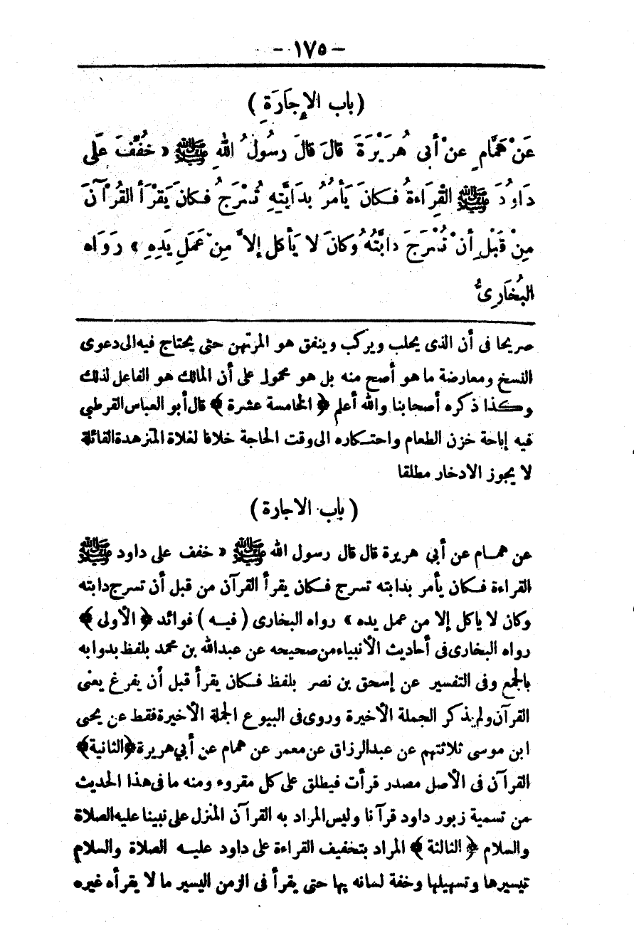 (بَابُ الْإِجَارَةِ) عَنْ هَمَّامٍ عَنْ أَبِي هُرَيْرَةَ قَالَ: قَالَ رَسُولُ اللَّهِ - صَلَّى اللَّهُ عَلَيْهِ وَسَلَّمَ - «خُفِّفَ عَلَى دَاوُد - صَلَّى اللَّهُ عَلَيْهِ وَسَلَّمَ - الْقِرَاءَةُ فَكَانَ يَأْمُرُ بِدَابَّتِهِ تُسْرَجُ فَكَانَ يَقْرَأُ الْقُرْآنَ مِنْ قَبْلِ أَنْ تُسْرَجَ دَابَّتُهُ وَكَانَ لَا يَأْكُلُ إلَّا مِنْ عَمَلِ يَدِهِ» رَوَاهُ الْبُخَارِيُّ.