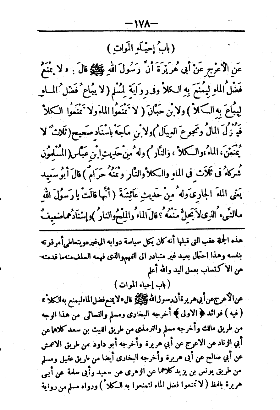 بَابُ إحْيَاءِ الْمَوَاتِ) عَنْ الْأَعْرَجِ عَنْ أَبِي هُرَيْرَةَ أَنَّ رَسُولَ اللَّهِ - صَلَّى اللَّهُ عَلَيْهِ وَسَلَّمَ - قَالَ: «لَا يُمْنَعُ فَضْلُ الْمَاءِ لِيُمْنَعَ بِهِ الْكَلَأُ» وَفِي رِوَايَةٍ لِمُسْلِمٍ «لَا يُبَاعُ فَضْلُ الْمَاءِ لِيُبَاعَ بِهِ الْكَلَأُ» وَلِابْنِ حِبَّانَ «لَا تَمْنَعُوا الْمَاءَ وَلَا تَمْنَعُوا الْكَلَأَ فَيَنْزِلُ الْمَالُ وَتَجُوعُ الْعِيَالُ» وَلِابْنِ مَاجَهْ بِإِسْنَادٍ صَحِيحٍ «ثَلَاثٌ لَا يُمْنَعْنَ الْمَاءُ وَالْكَلَأُ وَالنَّارُ» وَلَهُ مِنْ حَدِيثِ ابْنِ عَبَّاسٍ «الْمُسْلِمُونَ شُرَكَاءُ فِي ثَلَاثٍ فِي الْمَاءِ وَالْكَلَأِ وَالنَّارِ وَثَمَنُهُ حَرَامٌ» قَالَ أَبُو سَعِيدٍ يَعْنِي الْمَاءَ الْجَارِيَ، وَلَهُ مِنْ حَدِيثِ عَائِشَةَ أَنَّهَا قَالَتْ «يَا رَسُولَ اللَّهِ مَا الشَّيْءُ الَّذِي لَا يَحِلُّ مَنْعُهُ؟ قَالَ الْمَاءُ وَالْمِلْحُ وَالنَّارُ» ، وَإِسْنَادُهُمَا ضَعِيفٌ..