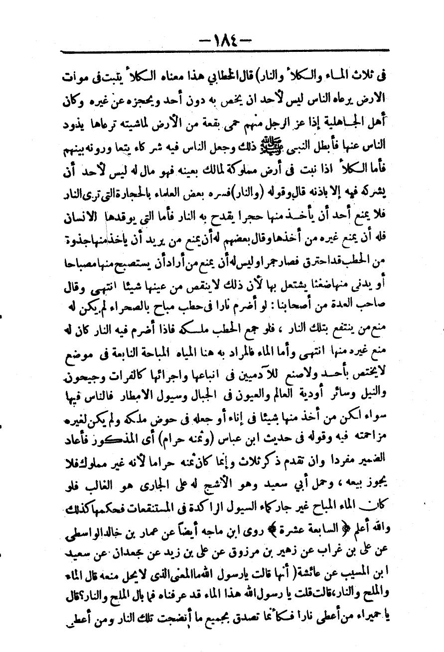 ـــــــــــــــــــــــــــــQفِي ثَلَاثٍ الْمَاءُ وَالْكَلَأُ وَالنَّارُ» قَالَ الْخَطَّابِيُّ: هَذَا مَعْنَاهُ الْكَلَأُ يَثْبُتُ فِي مَوَاتِ الْأَرْضِ يَرْعَاهُ النَّاسُ لَيْسَ لِأَحَدٍ أَنْ يُخَصَّ بِهِ دُونَ أَحَدٍ وَيَحْجِزَهُ عَنْ غَيْرِهِ وَكَانَ أَهْلُ الْجَاهِلِيَّةِ إذَا عَزَّ الرَّجُلُ مِنْهُمْ حَمِيَ بُقْعَةً مِنْ الْأَرْضِ لِمَاشِيَتِهِ تَرْعَاهَا يَذُودُ النَّاسَ عَنْهَا فَأَبْطَلَ النَّبِيُّ - صَلَّى اللَّهُ عَلَيْهِ وَسَلَّمَ - ذَلِكَ وَجَعَلَ النَّاسَ فِيهِ شُرَكَاءَ يَتَعَاوَرُونَهُ بَيْنَهُمْ فَأَمَّا الْكَلَأُ إذَا نَبَتَ فِي أَرْضٍ مَمْلُوكَةٍ لِمَالِكٍ بِعَيْنِهِ فَهُوَ مَالٌ لَهُ لَيْسَ لِأَحَدٍ أَنْ يُشْرِكَهُ فِيهِ إلَّا بِإِذْنِهِ قَالَ: وَقَوْلُهُ (وَالنَّارُ) فَسَّرَهُ بَعْضُ الْعُلَمَاءِ بِالْحِجَارَةِ الَّتِي تُرْبِي النَّارَ فَلَا يُمْنَعُ أَحَدٌ أَنْ يَأْخُذَ مِنْهَا حَجَرًا يَقْدَحُ بِهِ النَّارَ فَأَمَّا الَّتِي يُوقِدُهَا الْإِنْسَانُ فَلَهُ أَنْ يَمْنَعَ غَيْرَهُ مِنْ أَخْذِهَا وَقَالَ بَعْضُهُمْ: لَهُ أَنْ يَمْنَعَ مَنْ يُرِيدُ أَنْ يَأْخُذَ مِنْهَا جَذْوَةً مِنْ الْحَطَبِ قَدْ احْتَرَقَ فَصَارَ جَمْرًا، وَلَيْسَ لَهُ أَنْ يَمْنَعَ مَنْ أَرَادَ أَنْ يَسْتَصْبِحَ مِنْهَا مِصْبَاحًا أَوْ يُدْنِيَ مِنْهَا ضِغْثًا يَشْتَعِلُ بِهَا؛ لِأَنَّ ذَلِكَ لَا يُنْقِصُ مِنْ عَيْنِهَا شَيْئًا. انْتَهَى.