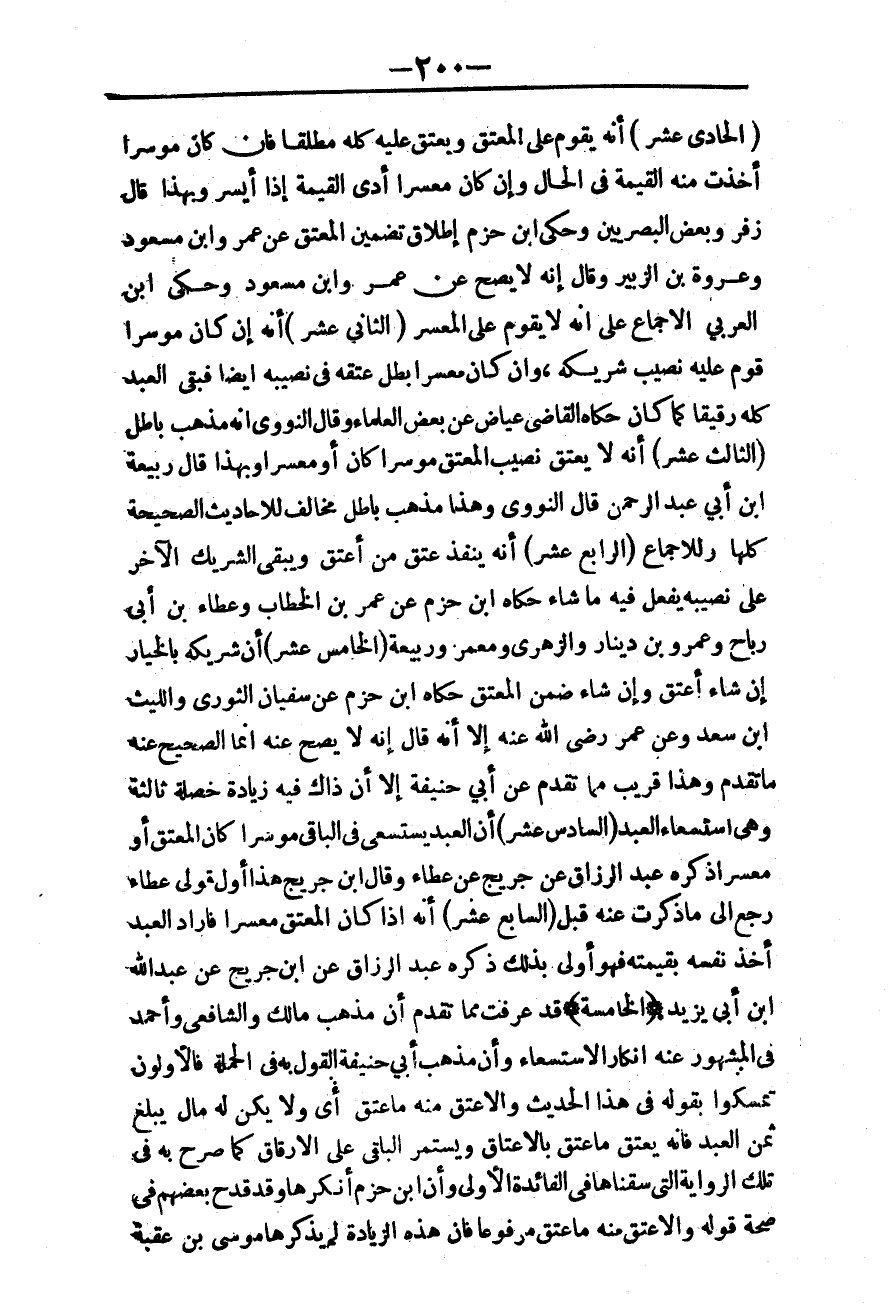 ـــــــــــــــــــــــــــــQ (الْحَادِيَ عَشَرَ) أَنَّهُ يُقَوَّمُ عَلَى الْمُعْتِقِ وَيُعْتَقُ عَلَيْهِ كُلُّهُ مُطْلَقًا فَإِنْ كَانَ مُوسِرًا أُخِذَتْ مِنْهُ الْقِيمَةُ فِي الْحَالِ، وَإِنْ كَانَ مُعْسِرًا أَدَّى الْقِيمَةَ إذَا أَيْسَرَ، وَبِهَذَا قَالَ زُفَرُ وَبَعْضُ الْبَصْرِيِّينَ وَحَكَى ابْنُ حَزْمٍ إطْلَاقَ تَضْمِينِ الْمُعْتِقِ عَنْ عُمَرَ وَابْنِ مَسْعُودٍ وَعُرْوَةَ بْنِ الزُّبَيْرِ وَقَالَ: إنَّهُ لَا يَصِحُّ عَنْ عُمَرَ وَابْنِ مَسْعُودٍ وَحَكَى ابْنُ الْعَرَبِيِّ الْإِجْمَاعَ عَلَى أَنَّهُ لَا يُقَوَّمُ عَلَى الْمُعْسِرِ.