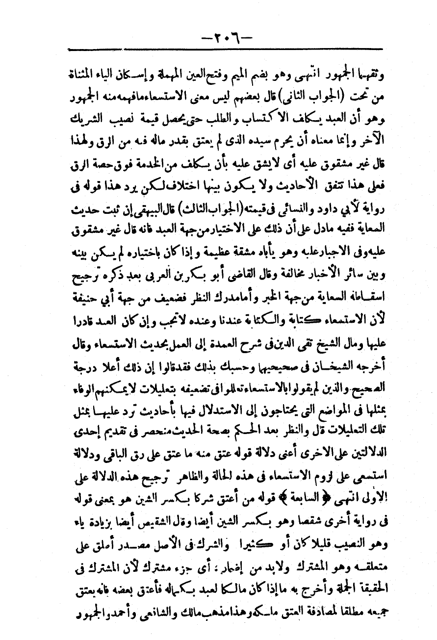 (الْجَوَابُ الثَّانِي) قَالَ بَعْضُهُمْ لَيْسَ مَعْنَى الِاسْتِسْعَاءِ مَا فَهِمَهُ مِنْهُ الْجُمْهُورُ وَهُوَ أَنَّ الْعَبْدَ يُكَلَّفُ الِاكْتِسَابَ وَالطَّلَبَ حَتَّى يُحَصِّلَ قِيمَةَ نَصِيبِ الشَّرِيكِ الْآخَرِ، وَإِنَّمَا مَعْنَاهُ أَنْ يُحْرَمَ سَيِّدُهُ الَّذِي لَمْ يَعْتِقْ بِقَدْرِ مَا لَهُ فِيهِ مِنْ الرِّقِّ وَلِهَذَا قَالَ «غَيْرَ مَشْقُوقٍ عَلَيْهِ» أَيْ لَا يَشُقُّ عَلَيْهِ بِأَنْ يُكَلَّفَ مِنْ الْخِدْمَةِ فَوْقَ حِصَّةِ الرِّقِّ فَعَلَى هَذَا تَتَّفِقُ الْأَحَادِيثُ وَلَا يَكُونُ بَيْنَهَا اخْتِلَافٌ لَكِنْ يَرُدُّ هَذَا قَوْلُهُ فِي رِوَايَةٍ لِأَبِي دَاوُد وَالنَّسَائِيُّ فِي قِيمَتِهِ.