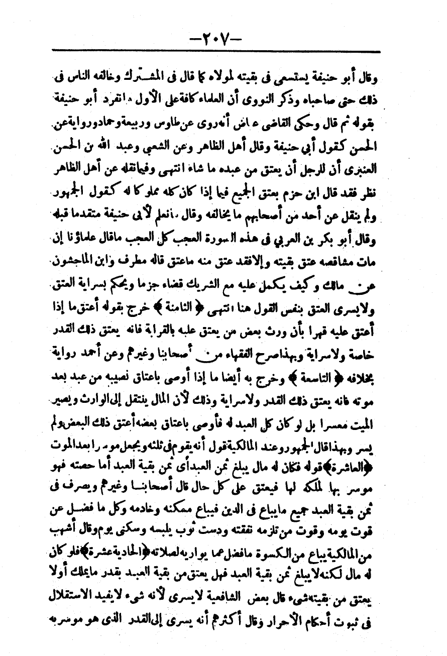 وَفِيمَا نَقَلَهُ عَنْ أَهْلِ الظَّاهِرِ نَظَرٌ فَقَدْ قَالَ ابْنُ حَزْمٍ بِعِتْقِ الْجَمِيعِ فِيمَا إذَا كَانَ كُلُّهُ مَمْلُوكًا لَهُ كَقَوْلِ الْجُمْهُورِ وَلَمْ يُنْقَلْ عَنْ أَحَدٍ مِنْ أَصْحَابِهِمْ مَا يُخَالِفُهُ وَقَالَ: مَا نَعْلَمُ لِأَبِي حَنِيفَةَ مُتَقَدِّمًا قَبْلَهُ. وَقَالَ أَبُو بَكْرِ بْنُ الْعَرَبِيِّ فِي هَذِهِ الصُّورَةِ الْعَجَبُ كُلُّ الْعَجَبِ مَا قَالَ عُلَمَاؤُنَا إنْ مَاتَ مُشَاقِصُهُ عَتَقَ بَقِيَّتَهُ، وَإِلَّا فَقَدْ عَتَقَ مِنْهُ مَا عَتَقَ قَالَهُ مُطَرِّفٌ وَابْنُ الْمَاجِشُونِ عَنْ مَالِكٍ وَكَيْفَ يَكْمُلُ عَلَيْهِ مَعَ الشَّرِيكِ قَضَاءً جَزْمًا وَيُحْكَمُ بِسِرَايَةِ الْعِتْقِ وَلَا يَسْرِي الْعِتْقُ بِنَفْسِ الْقَوْلِ هُنَا. انْتَهَى.