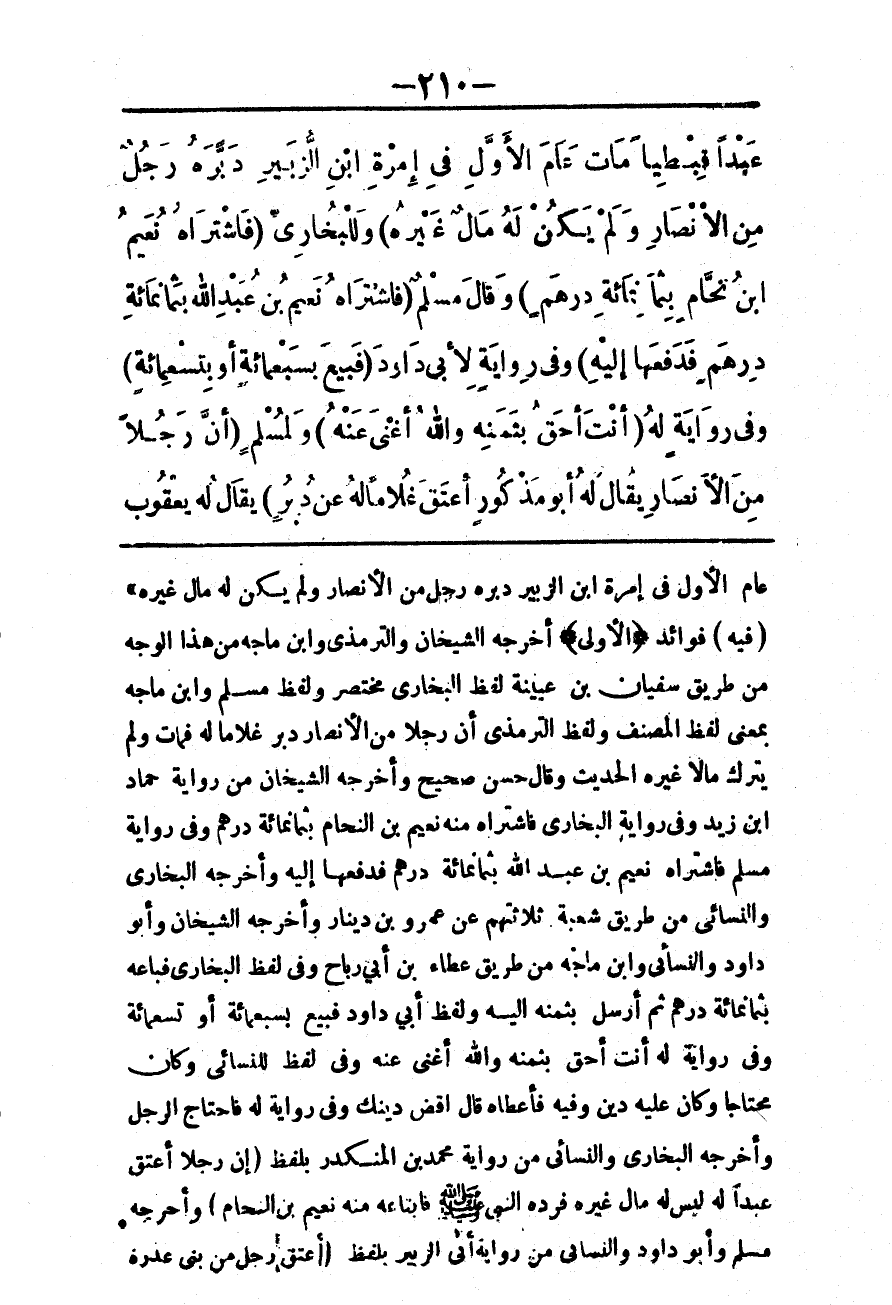(الْأُولَى) أَخْرَجَهُ الشَّيْخَانِ وَالتِّرْمِذِيُّ وَابْنُ مَاجَهْ مِنْ هَذَا الْوَجْهِ مِنْ طَرِيقِ سُفْيَانَ بْنِ عُيَيْنَةَ لَفْظُ الْبُخَارِيِّ مُخْتَصَرٌ وَلَفْظُ مُسْلِمٍ وَابْنِ مَاجَهْ بِمَعْنَى لَفْظِ الْمُصَنِّفِ وَلَفْظُ التِّرْمِذِيِّ «أَنَّ رَجُلًا مِنْ الْأَنْصَارِ دَبَّرَ غُلَامًا لَهُ فَمَاتَ، وَلَمْ يَتْرُكْ مَالًا غَيْرَهُ» الْحَدِيثَ