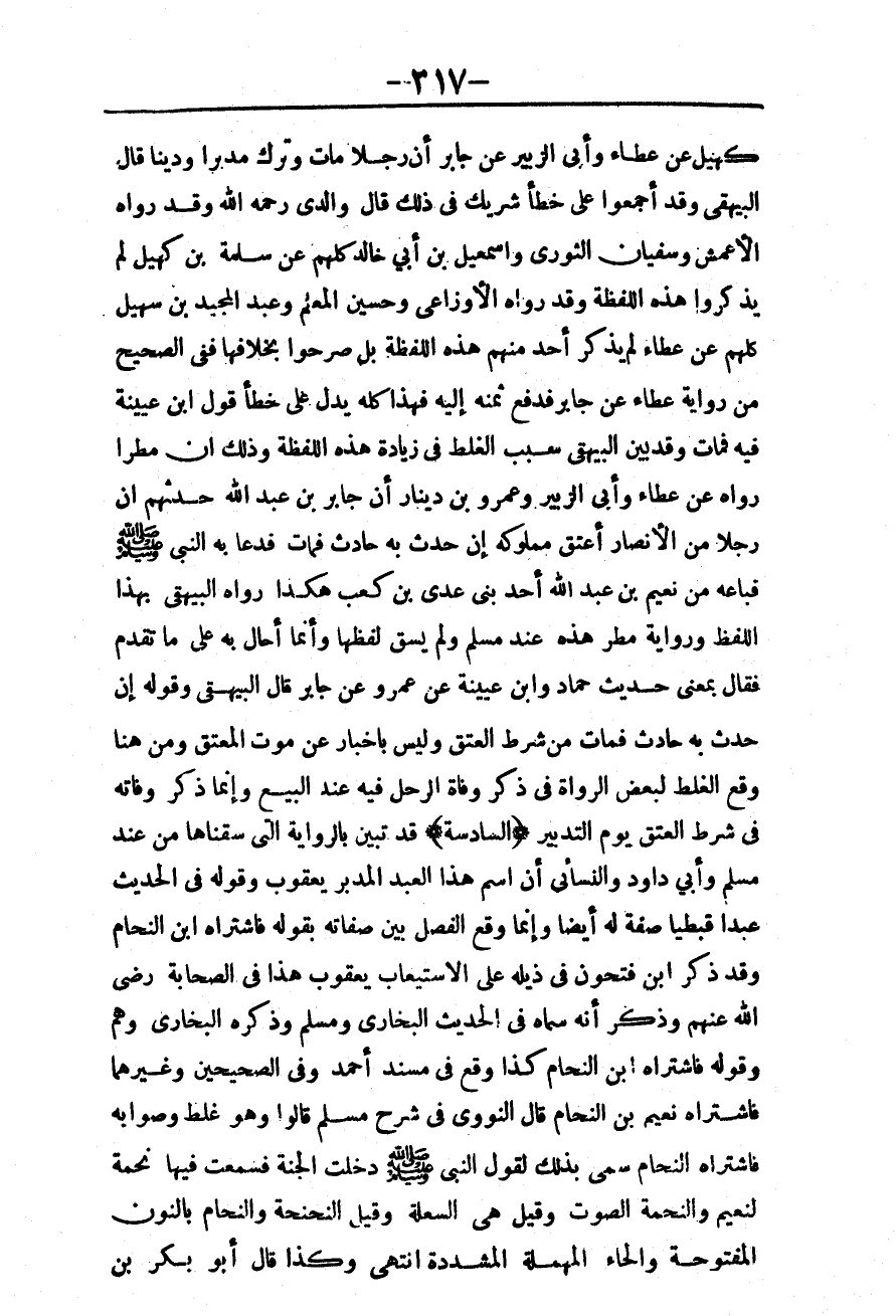 أَنَّ جَابِرَ بْنَ عَبْدِ اللَّهِ حَدَّثَهُمْ «أَنَّ رَجُلًا مِنْ الْأَنْصَارِ أَعْتَقَ مَمْلُوكَهُ إنْ حَدَثَ بِهِ حَادِثٌ فَمَاتَ فَدَعَا بِهِ النَّبِيُّ - صَلَّى اللَّهُ عَلَيْهِ وَسَلَّمَ - فَبَاعَهُ مِنْ نُعَيْمِ بْنِ عَبْدِ اللَّهِ أَحَدُ بَنِي عَدِيِّ بْنِ كَعْبٍ» هَكَذَا رَوَاهُ الْبَيْهَقِيُّ بِهَذَا اللَّفْظِ وَرِوَايَةُ مَطَرٍ هَذِهِ عِنْدَ مُسْلِمٍ وَلَمْ يَسُقْ لَفْظَهَا وَإِنَّمَا أَحَالَ بِهِ عَلَى مَا تَقَدَّمَ فَقَالَ بِمَعْنَى حَدِيثِ حَمَّادٍ وَابْنِ عُيَيْنَةَ عَنْ عَمْرٍو عَنْ جَابِرٍ قَالَ الْبَيْهَقِيُّ وَقَوْلُهُ «إنْ حَدَثَ بِهِ حَادِثٌ فَمَاتَ» مِنْ شَرْطِ الْعِتْقِ وَلَيْسَ بِإِخْبَارٍ عَنْ مَوْتِ الْمُعْتِقِ، وَمِنْ هُنَا وَقَعَ الْغَلَطُ لِبَعْضِ الرُّوَاةِ فِي ذِكْرِ وَفَاةِ الرَّجُلِ فِيهِ عِنْدَ الْبَيْعِ وَإِنَّمَا ذَكَرَ وَفَاتَهُ فِي شَرْطِ الْعِتْقِ يَوْمَ التَّدْبِيرِ.