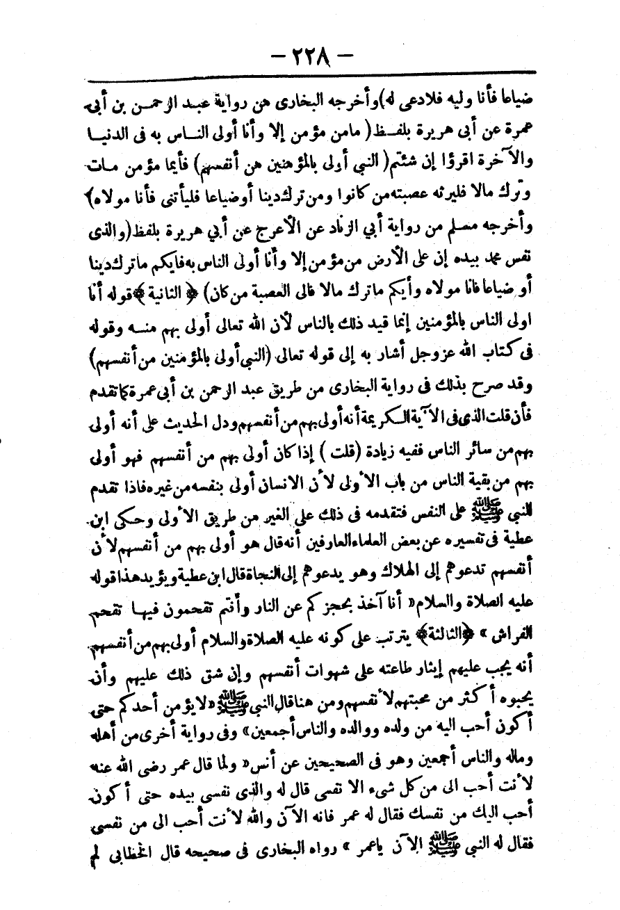 (الثَّالِثَةُ) يَتَرَتَّبُ عَلَى كَوْنِهِ - عَلَيْهِ الصَّلَاةُ وَالسَّلَامُ - أَوْلَى بِهِمْ مِنْ أَنْفُسِهِمْ أَنَّهُ يَجِبُ عَلَيْهِمْ إيثَارُ طَاعَتِهِ عَلَى شَهَوَاتِ أَنْفُسِهِمْ، وَإِنْ شَقَّ ذَلِكَ عَلَيْهِمْ، وَأَنْ يُحِبُّوهُ أَكْثَرَ مِنْ مَحَبَّتِهِمْ لِأَنْفُسِهِمْ وَمِنْ هُنَا قَالَ النَّبِيُّ - صَلَّى اللَّهُ عَلَيْهِ وَسَلَّمَ - «لَا يُؤْمِنُ أَحَدُكُمْ حَتَّى أَكُونَ أَحَبَّ إلَيْهِ مِنْ وَلَدِهِ وَوَالِدِهِ وَالنَّاسِ أَجْمَعِينَ» وَفِي رِوَايَةٍ أُخْرَى «مِنْ أَهْلِهِ وَمَالِهِ وَالنَّاسِ أَجْمَعِينَ» وَهُوَ فِي الصَّحِيحَيْنِ عَنْ أَنَسٍ «وَلَمَّا قَالَ عُمَرُ - رَضِيَ اللَّهُ عَنْهُ - لَأَنْتَ أَحَبُّ إلَيَّ مِنْ كُلِّ شَيْءٍ إلَّا نَفْسِي قَالَ لَهُ وَاَلَّذِي نَفْسِي بِيَدِهِ حَتَّى أَكُونَ أَحَبَّ إلَيْك مِنْ نَفْسِك فَقَالَ لَهُ عُمَرُ فَإِنَّهُ الْآنَ وَاَللَّهِ لَأَنْتَ أَحَبُّ إلَيَّ مِنْ نَفْسِي فَقَالَ لَهُ النَّبِيُّ - صَلَّى اللَّهُ عَلَيْهِ وَسَلَّمَ - الْآنَ يَا عُمَرُ»