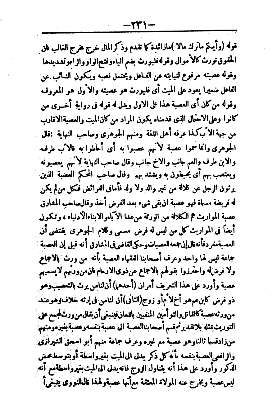 ـــــــــــــــــــــــــــــQقَوْلُهُ «وَأَيُّكُمْ مَا تَرَكَ مَالًا» مَا زَائِدَةٌ كَمَا تَقَدَّمَ وَذِكْرُ الْمَالِ خَرَجَ مَخْرَجَ الْغَالِبِ فَإِنَّ الْحُقُوقَ تُوَرَّثُ كَالْأَمْوَالِ وَقَوْلُهُ فَلْيُوَرَّثْ بِضَمِّ الْيَاءِ وَفَتْحِ الْوَاوِ وَالرَّاءِ وَتَشْدِيدِهَا وَقَوْلُهُ عَصَبَتُهُ مَرْفُوعٌ لِنِيَابَتِهِ عَنْ الْفَاعِلِ وَيَحْتَمِلُ نَصْبَهُ وَيَكُونُ النَّائِبُ عَنْ الْفَاعِلِ ضَمِيرًا يَعُودُ عَلَى الْمَيِّتِ أَيْ فَلْيُوَرِّثْ هُوَ عَصَبَتَهُ وَالْأَوَّلُ هُوَ الْمَعْرُوفُ. وَقَوْلُهُ مَنْ كَانَ أَيْ الْعَصَبَةُ هَذَا عَلَى الْأَوَّلِ وَيَدُلُّ لَهُ قَوْلُهُ فِي رِوَايَةٍ أُخْرَى مَنْ كَانُوا، وَعَلَى الِاحْتِمَالِ الَّذِي قَدَّمْنَاهُ يَكُونُ الْمُرَادُ مَنْ كَانَ الْمَيِّتَ وَالْعَصَبَةُ الْأَقَارِبُ مِنْ جِهَةِ الْأَبِ كَذَا عَرَفَهُ أَهْلُ اللُّغَةِ وَمِنْهُمْ الْجَوْهَرِيُّ وَصَاحِبُ النِّهَايَةِ: قَالَ الْجَوْهَرِيُّ وَإِنَّمَا سُمُّوا عَصَبَةً؛ لِأَنَّهُمْ عَصَبُوا بِهِ أَيْ أَحَاطُوا بِهِ فَالْأَبُ طَرَفٌ وَالِابْنُ طَرَفٌ وَالْعَمُّ جَانِبٌ وَالْأَخُ جَانِبٌ. وَقَالَ صَاحِبُ النِّهَايَةِ: لِأَنَّهُمْ يَعْصِبُونَهُ وَيَعْتَصِبُ بِهِمْ أَيْ يُحِيطُونَ بِهِ وَيَشْتَدُّ بِهِمْ. وَقَالَ صَاحِبُ الْمُحْكَمِ: الْعَصَبَةُ الَّذِينَ يَرِثُونَ الرَّجُلَ عَنْ كَلَالَةٍ مِنْ غَيْرِ وَالِدٍ وَلَا وَلَدٍ فَأَمَّا فِي الْفَرَائِضِ فَكُلُّ مَنْ لَمْ يَكُنْ لَهُ فَرِيضَةٌ مُسَمَّاةٌ فَهُوَ عَصَبَةٌ إنْ بَقِيَ شَيْءٌ بَعْدَ الْفَرْضِ أَخَذَ. وَقَالَ صَاحِبُ الْمَشَارِقِ: عَصَبَةُ الْمَوَارِيثِ هُمْ الْكَلَالَةُ مِنْ الْوَرَثَةِ مِنْ عَدَا الْآبَاءِ وَالْأَبْنَاءِ الْأَدْنِيَاءِ، وَتَكُونُ أَيْضًا فِي الْمَوَارِيثِ كُلُّ مَنْ لَيْسَ لَهُ فَرْضٌ مُسَمًّى وَكَلَامُ الْجَوْهَرِيِّ يَقْتَضِي أَنَّ الْعَصَبَةَ مُفْرَدٌ فَإِنَّهُ قَالَ: إنَّ جَمْعَهُ الْعَصَبَاتُ وَحَكَى الْقَاضِي فِي الْمَشَارِقِ أَنَّهُ قِيلَ: إنَّ الْعَصَبَةَ جَمَاعَةٌ لَيْسَ لَهَا وَاحِدٌ وَعَرَّفَ أَصْحَابُنَا الْفُقَهَاءُ الْعَصَبَةَ بِأَنَّهُ مَنْ وَرِثَ بِالْإِجْمَاعِ وَلَا فَرْضَ لَهُ وَاحْتَرَزُوا بِقَوْلِهِمْ بِالْإِجْمَاعِ عَنْ ذَوِي الْأَرْحَامِ فَإِنَّ مَنْ وَرَّثَهُمْ لَا يُسَمِّيهِمْ عَصَبَةً.