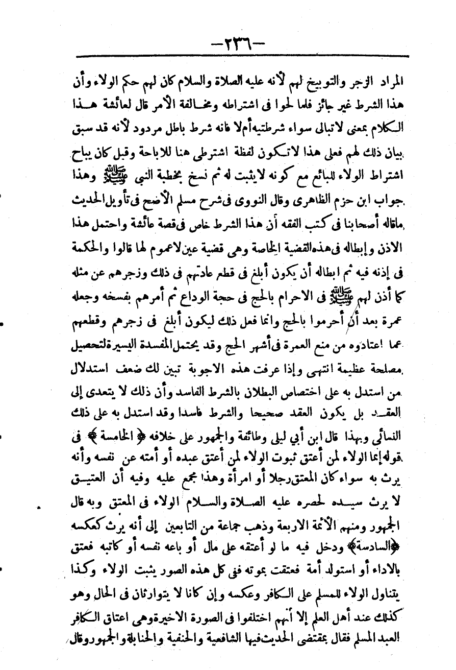 ـــــــــــــــــــــــــــــQالْمُرَادُ الزَّجْرُ وَالتَّوْبِيخُ لَهُمْ؛ لِأَنَّهُ - عَلَيْهِ الصَّلَاةُ وَالسَّلَامُ - كَانَ لَهُمْ حُكْمُ الْوَلَاءِ، وَأَنَّ هَذَا الشَّرْطَ غَيْرُ جَائِزٍ فَلَمَّا لَحُّوا فِي اشْتِرَاطِهِ وَمُخَالَفَةِ الْأَمْرِ قَالَ لِعَائِشَةَ هَذَا الْكَلَامَ بِمَعْنَى لَا تُبَالِي سَوَاءٌ شَرَطْتِيهِ أَمْ لَا فَإِنَّهُ شَرْطٌ بَاطِلٌ مَرْدُودٌ؛ لِأَنَّهُ قَدْ سَبَقَ بَيَانُ ذَلِكَ لَهُمْ فَعَلَى هَذَا لَا تَكُونُ لَفْظَةُ اشْتَرِطِي هُنَا لِلْإِبَاحَةِ. وَقِيلَ كَانَ يُبَاحُ اشْتِرَاطُ الْوَلَاءِ لِلْبَائِعِ مَعَ كَوْنِهِ لَا يَثْبُتُ لَهُ ثُمَّ نُسِخَ بِخُطْبَةِ النَّبِيِّ - صَلَّى اللَّهُ عَلَيْهِ وَسَلَّمَ - وَهَذَا جَوَابُ ابْنِ حَزْمٍ الظَّاهِرِيِّ وَقَالَ النَّوَوِيُّ فِي شَرْحِ مُسْلِمٍ: الْأَصَحُّ فِي تَأْوِيلِ الْحَدِيثِ مَا قَالَهُ أَصْحَابُنَا فِي كُتُبِ الْفِقْهِ: أَنَّ هَذَا الشَّرْطَ خَاصٌّ فِي قِصَّةِ عَائِشَةَ وَاحْتَمَلَ هَذَا الْإِذْنَ وَإِبْطَالَهُ فِي هَذِهِ الْقَضِيَّةِ الْخَاصَّةِ، وَهِيَ قَضِيَّةُ عَيْنٍ لَا عُمُومَ لَهَا.