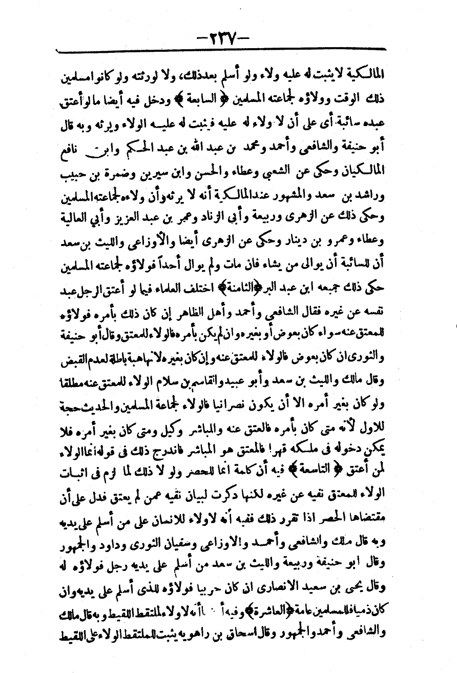 (السَّابِعَةُ) وَدَخَلَ فِيهِ أَيْضًا مَا لَوْ أَعْتَقَ عَبْدَهُ سَائِبَةً أَيْ عَلَى أَنْ لَا وَلَاءَ لَهُ عَلَيْهِ فَيَثْبُتُ لَهُ عَلَيْهِ الْوَلَاءُ وَيَرِثُهُ وَبِهِ قَالَ أَبُو حَنِيفَةَ وَالشَّافِعِيُّ وَأَحْمَدُ وَمُحَمَّدُ بْنُ عَبْدِ اللَّهِ بْنِ عَبْدِ الْحَكَمِ وَابْنُ نَافِعٍ الْمَالِكِيَّانِ، وَحُكِيَ عَنْ الشَّعْبِيِّ وَعَطَاءٍ وَالْحَسَنِ وَابْنِ سِيرِينَ وَضَمْرَةَ بْنِ حَبِيبٍ وَرَاشِدِ بْنِ سَعْدٍ. وَالْمَشْهُورُ عِنْدَ الْمَالِكِيَّةِ أَنَّهُ لَا يَرِثُهُ، وَأَنَّ وَلَاءَهُ لِجَمَاعَتِهِ الْمُسْلِمِينَ وَحُكِيَ ذَلِكَ عَنْ الزُّهْرِيِّ وَرَبِيعَةَ وَأَبِي الزِّنَادِ وَعُمَرَ بْنِ عَبْدِ الْعَزِيزِ وَأَبِي الْعَالِيَةِ وَعَطَاءٍ وَعَمْرِو بْنِ دِينَارٍ وَحُكِيَ عَنْ الزُّهْرِيِّ أَيْضًا وَالْأَوْزَاعِيِّ وَاللَّيْثِ بْنِ سَعْدٍ أَنَّ لِلسَّائِبَةِ أَنْ يُوَالِيَ مَنْ يَشَاءُ فَإِنْ مَاتَ وَلَمْ يُوَالِ أَحَدًا فَوَلَاؤُهُ لِجَمَاعَتِهِ الْمُسْلِمِينَ حَكَى ذَلِكَ جَمِيعَهُ ابْنُ عَبْدِ الْبَرِّ.