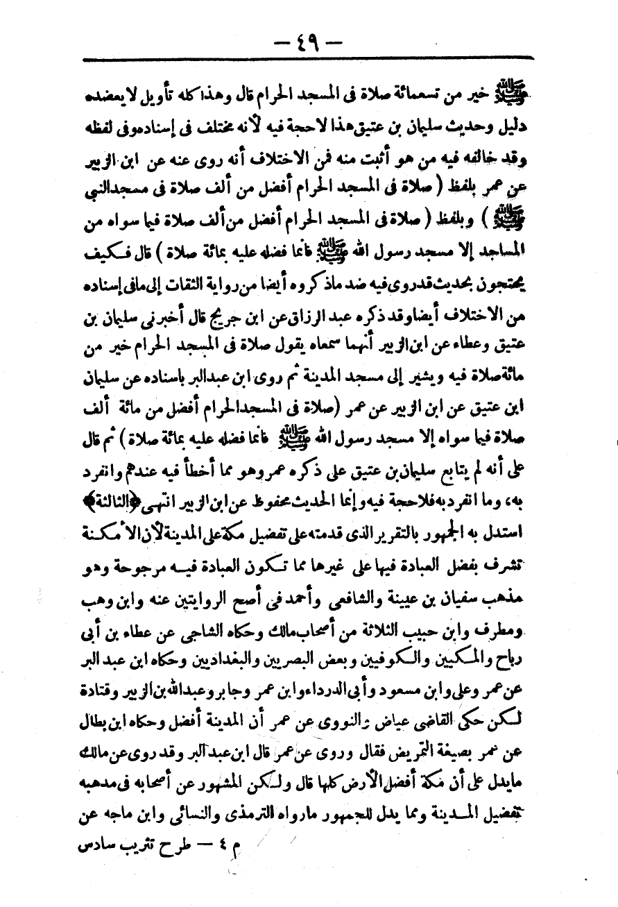 ـــــــــــــــــــــــــــــQ- صَلَّى اللَّهُ عَلَيْهِ وَسَلَّمَ - خَيْرٌ مِنْ تِسْعِمِائَةِ صَلَاةٍ فِي الْمَسْجِدِ الْحَرَامِ قَالَ وَهَذَا كُلُّهُ تَأْوِيلٌ لَا يَعْضُدُهُ دَلِيلٌ، وَحَدِيثُ سُلَيْمَانَ بْنِ عَتِيقٍ هَذَا لَا حُجَّةَ فِيهِ؛ لِأَنَّهُ مُخْتَلَفٌ فِي إسْنَادِهِ، وَفِي لَفْظِهِ، وَقَدْ خَالَفَهُ فِيهِ مَنْ هُوَ أَثْبَتُ مِنْهُ فَمِنْ الِاخْتِلَافِ أَنَّهُ رُوِيَ عَنْهُ عَنْ ابْنِ الزُّبَيْرِ عَنْ عُمَرَ بِلَفْظِ (صَلَاةٌ فِي الْمَسْجِدِ الْحَرَامِ أَفْضَلُ مِنْ أَلْفِ صَلَاةٍ فِي مَسْجِدِ النَّبِيِّ - صَلَّى اللَّهُ عَلَيْهِ وَسَلَّمَ -) وَبِلَفْظِ «صَلَاةٌ فِي الْمَسْجِدِ الْحَرَامِ أَفْضَلُ مِنْ أَلْفِ صَلَاةٍ فِيمَا سِوَاهُ مِنْ الْمَسَاجِدِ إلَّا مَسْجِدَ رَسُولِ اللَّهِ - صَلَّى اللَّهُ عَلَيْهِ وَسَلَّمَ - فَإِنَّمَا فَضَّلَهُ عَلَيْهِ بِمِائَةِ صَلَاةٍ» . قَالَ: فَكَيْفَ يَحْتَجُّونَ بِحَدِيثٍ قَدْ رُوِيَ فِيهِ ضِدُّ مَا ذَكَرُوهُ أَيْضًا مِنْ رِوَايَةِ الثِّقَاتِ إلَى مَا فِي إسْنَادِهِ مِنْ الِاخْتِلَافِ أَيْضًا، وَقَدْ ذَكَرَهُ عَبْدُ الرَّزَّاقِ عَنْ ابْنِ جُرَيْجٍ قَالَ أَخْبَرَنِي سُلَيْمَانُ بْنُ عَتِيقٍ، وَعَطَاءٌ عَنْ ابْنِ الزُّبَيْرِ أَنَّهُمَا سَمِعَاهُ يَقُولُ صَلَاةٌ فِي الْمَسْجِدِ الْحَرَامِ خَيْرٌ مِنْ مِائَةِ صَلَاةٍ فِيهِ وَيُشِيرُ إلَى مَسْجِدِ الْمَدِينَةِ ثُمَّ رَوَى ابْنُ عَبْدِ الْبَرِّ بِإِسْنَادِهِ عَنْ سُلَيْمَانَ بْنِ عَتِيقٍ عَنْ ابْنِ الزُّبَيْرِ عَنْ عُمَرَ (صَلَاةٌ فِي الْمَسْجِدِ الْحَرَامِ أَفْضَلُ مِنْ مِائَةِ أَلْفِ صَلَاةٍ فِيمَا سِوَاهُ إلَّا مَسْجِدَ رَسُولِ اللَّهِ - صَلَّى اللَّهُ عَلَيْهِ وَسَلَّمَ - فَإِنَّمَا فَضَّلَهُ عَلَيْهِ بِمِائَةِ صَلَاةٍ) ثُمَّ قَالَ عَلَى أَنَّهُ لَمْ يُتَابِعْ سُلَيْمَانُ ابْنُ عَتِيقٍ عَلَى ذِكْرِهِ عُمَرَ وَهُوَ مِمَّا أَخْطَأَ فِيهِ عِنْدَهُمْ وَانْفَرَدَ بِهِ، وَمَا انْفَرَدَ بِهِ فَلَا حُجَّةَ فِيهِ، وَإِنَّمَا الْحَدِيثُ مَحْفُوظٌ عَنْ ابْنِ الزُّبَيْرِ. انْتَهَى.