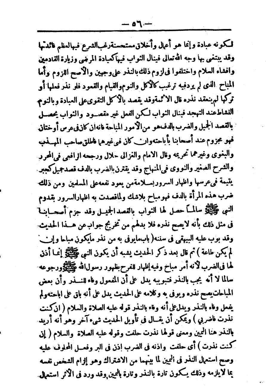 وَقَالَ الْإِمَامُ وَالْغَزَالِيُّ: حَلَالٌ وَرَجَّحَهُ الرَّافِعِيُّ فِي الْمُحَرَّرِ وَالشَّرْحِ الصَّغِيرِ وَالنَّوَوِيُّ فِي الْمِنْهَاجِ، وَقَدْ يَقْتَرِنُ بِالضَّرْبِ بِالدُّفِّ قَصْدٌ جَمِيلٌ كَجَبْرِ يَتِيمَةٍ فِي عُرْسِهَا وَإِظْهَارِ السُّرُورِ بِسَلَامَةِ مَنْ يَعُودُ نَفْعُهُ عَلَى الْمُسْلِمِينَ، وَمِنْ ذَلِكَ ضَرْبُ هَذِهِ الْمَرْأَةِ بِالدُّفِّ فَهُوَ مُبَاحٌ بِلَا شَكٍّ وَلَمَّا قَصَدَتْ بِهِ إظْهَارَ السُّرُورِ بِقُدُومِ النَّبِيِّ - صَلَّى اللَّهُ عَلَيْهِ وَسَلَّمَ - سَالِمًا حَصَلَ لَهَا الثَّوَابُ بِالْقَصْدِ الْجَمِيلِ، وَقَدْ جَزَمَ أَصْحَابُنَا فِي مِثْلِ ذَلِكَ بِأَنَّهُ لَا يَصِحُّ نَذْرُهُ فَلَا بُدَّ لَهُمْ مِنْ تَخْرِيجِ جَوَابٍ عَنْ هَذَا الْحَدِيثِ، وَقَدْ بَوَّبَ عَلَيْهِ الْبَيْهَقِيُّ فِي سُنَنِهِ (بَابُ مَا يُوَفَّى بِهِ مِنْ نَذْرِ مَا يَكُونُ مُبَاحًا وَإِنْ لَمْ يَكُنْ طَاعَةً) ثُمَّ قَالَ بَعْدَ ذِكْرِ الْحَدِيثِ يُشْبِهُ أَنْ يَكُونَ النَّبِيُّ - صَلَّى اللَّهُ عَلَيْهِ وَسَلَّمَ - إنَّمَا أَذِنَ لَهَا فِي الضَّرْبِ؛ لِأَنَّهُ أَمْرٌ مُبَاحٌ وَفِيهِ إظْهَارٌ لِلْفَرَحِ بِظُهُورِ رَسُولِ اللَّهِ - صَلَّى اللَّهُ عَلَيْهِ وَسَلَّمَ - وَرُجُوعِهِ سَالِمًا لَا أَنَّهُ يَجِبُ بِالنَّذْرِ فَتَبْوِيبُهُ يَدُلُّ عَلَى أَنَّ الْمَفْعُولَ وَفَاءٌ لِلنَّذْرِ وَأَنَّ بَعْضَ الْمُبَاحَاتِ يَصِحُّ نَذْرُهُ وَيُوَفَّى بِهِ. وَكَلَامُهُ عَلَى الْحَدِيثِ يَدُلُّ عَلَى أَنَّهُ بَاقٍ عَلَى إبَاحَتِهِ وَلَمْ يَفْعَلْ وَفَاءً بِالنَّذْرِ وَيَدُلُّ عَلَى أَنَّهُ وَفَاءٌ بِالنَّذْرِ قَوْلُهُ - عَلَيْهِ الصَّلَاةُ وَالسَّلَامُ - «إنْ كُنْتِ نَذَرْتِ فَاضْرِبِي» .