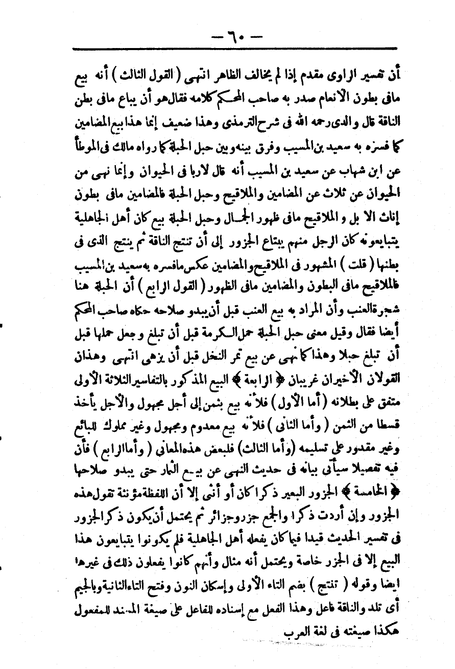 (الْقَوْلُ الثَّالِثُ) أَنَّهُ بَيْعُ مَا فِي بُطُونِ الْأَنْعَامِ صَدَّرَ بِهِ صَاحِبُ الْمُحْكَمِ كَلَامَهُ فَقَالَ هُوَ أَنْ يُبَاعَ مَا فِي بَطْنِ النَّاقَةِ قَالَ وَالِدِي - رَحِمَهُ اللَّهُ - فِي شَرْحِ التِّرْمِذِيِّ: وَهَذَا ضَعِيفٌ إنَّمَا هَذَا بَيْعُ الْمَضَامِينِ كَمَا فَسَّرَهُ بِهِ سَعِيدُ بْنُ الْمُسَيِّبِ وَفَرَّقَ بَيْنَهُ وَبَيْنَ حَبَلِ الْحَبَلَةِ كَمَا رَوَاهُ مَالِكٌ فِي الْمُوَطَّإِ عَنْ ابْنِ شِهَابٍ عَنْ سَعِيدِ بْنِ الْمُسَيِّبِ أَنَّهُ قَالَ: لَا رِبَا فِي الْحَيَوَانِ، وَإِنَّمَا نَهَى مِنْ الْحَيَوَانِ عَنْ ثَلَاثٍ عَنْ الْمَضَامِينِ وَالْمَلَاقِيحِ وَحَبَلِ الْحَبَلَةِ فَالْمَضَامِينُ مَا فِي بُطُونِ إنَاثِ الْإِبِلِ وَالْمَلَاقِيحُ مَا فِي ظُهُورِ الْجِمَالِ وَحَبَلُ الْحَبَلَةِ بَيْعٌ كَانَ أَهْلُ الْجَاهِلِيَّةِ يَتَبَايَعُونَهُ كَانَ الرَّجُلُ مِنْهُمْ يَبْتَاعُ الْجَزُورَ إلَى أَنْ تُنْتَجَ النَّاقَةُ ثُمَّ يُنْتَجُ الَّذِي فِي بَطْنِهَا. (قُلْتُ) الْمَشْهُورُ فِي الْمَلَاقِيحِ وَالْمَضَامِينِ عَكْسُ مَا فَسَّرَهُ بِهِ سَعِيدُ بْنُ الْمُسَيِّبِ فَالْمَلَاقِيحُ مَا فِي الْبُطُونِ وَالْمَضَامِينُ مَا فِي الظُّهُورِ.