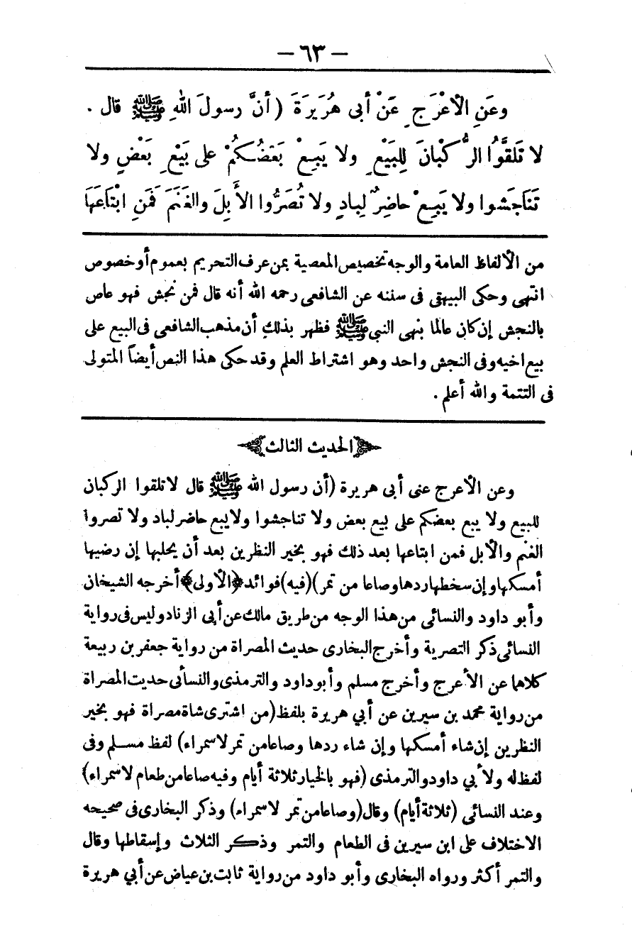 (الْحَدِيثُ الثَّالِثُ) وَعَنْ الْأَعْرَجِ عَنْ أَبِي هُرَيْرَةَ (أَنَّ رَسُولَ اللَّهِ - صَلَّى اللَّهُ عَلَيْهِ وَسَلَّمَ - قَالَ «لَا تَلَقَّوْا الرُّكْبَانَ لِلْبَيْعِ وَلَا يَبِعْ بَعْضُكُمْ عَلَى بَيْعِ بَعْضٍ وَلَا تَنَاجَشُوا وَلَا يَبِعْ حَاضِرٌ لِبَادٍ وَلَا تُصَرُّوا الْغَنَمَ وَالْإِبِلَ فَمَنْ ابْتَاعَهَا بَعْدَ ذَلِكَ فَهُوَ بِخَيْرِ النَّظَرَيْنِ بَعْدَ أَنْ يَحْلُبَهَا إنْ رَضِيَهَا أَمْسَكَهَا، وَإِنْ سَخِطَهَا رَدَّهَا وَصَاعًا مِنْ تَمْرٍ» ) .