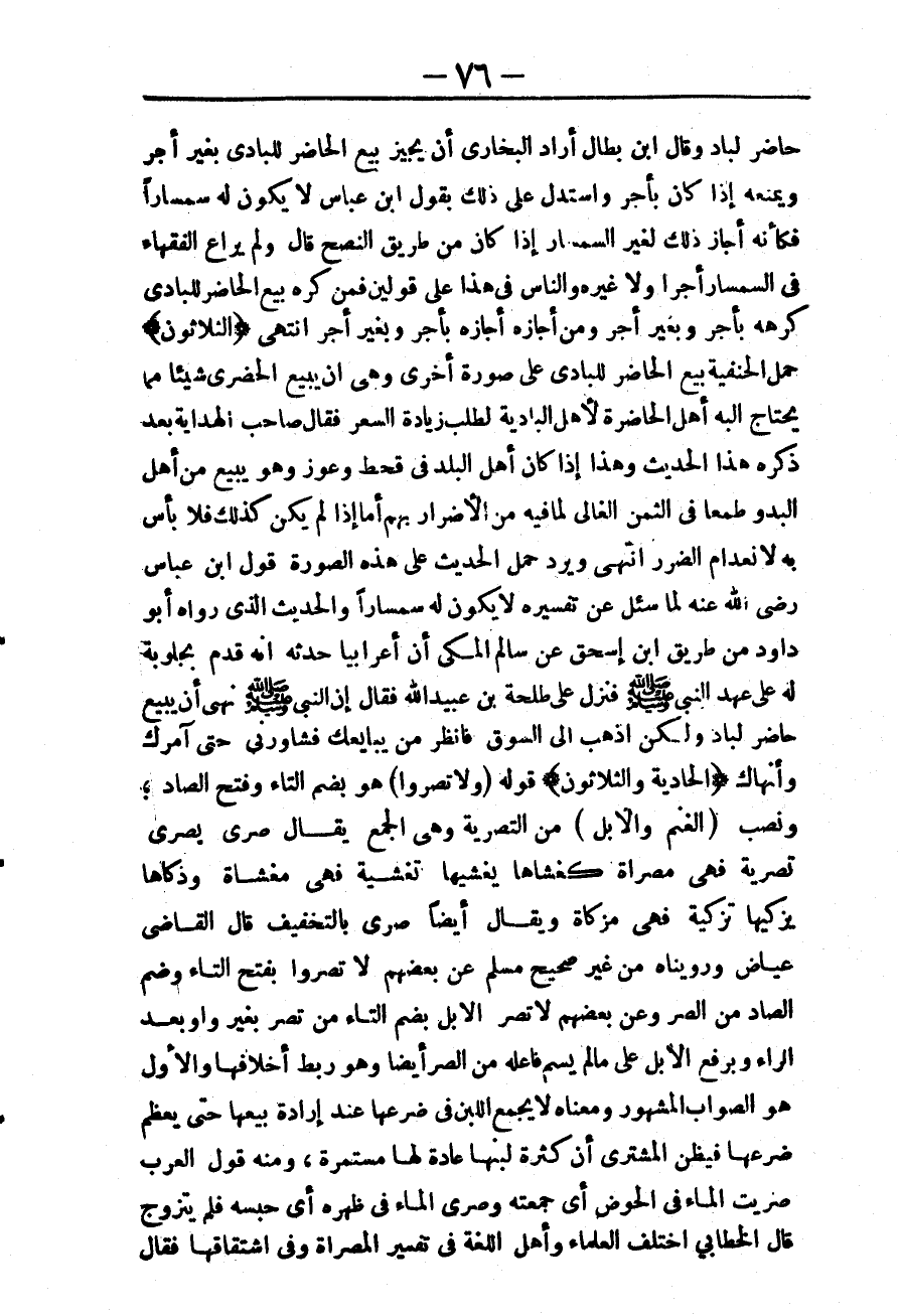 (الثَّلَاثُونَ) حَمَلَ الْحَنَفِيَّةُ بَيْعَ الْحَاضِرِ لِلْبَادِي عَلَى صُورَةٍ أُخْرَى وَهِيَ أَنْ يَبِيعَ الْحَضَرِيُّ شَيْئًا مِمَّا يَحْتَاجُ إلَيْهِ أَهْلُ الْحَاضِرَةِ لِأَهْلِ الْبَادِيَةِ لِطَلَبِ زِيَادَةِ السِّعْرِ فَقَالَ صَاحِبُ الْهِدَايَةِ بَعْدَ ذِكْرِهِ هَذَا الْحَدِيثَ وَهَذَا إذَا كَانَ أَهْلُ الْبَلَدِ فِي قَحْطٍ وَعَوَزٍ وَهُوَ يَبِيعُ مِنْ أَهْلِ الْبَدْوِ طَمَعًا فِي الثَّمَنِ الْغَالِي لِمَا فِيهِ مِنْ الْإِضْرَارِ بِهِمْ أَمَّا إذَا لَمْ يَكُنْ كَذَلِكَ فَلَا بَأْسَ بِهِ؛ لِانْعِدَامِ الضَّرَرِ انْتَهَى.