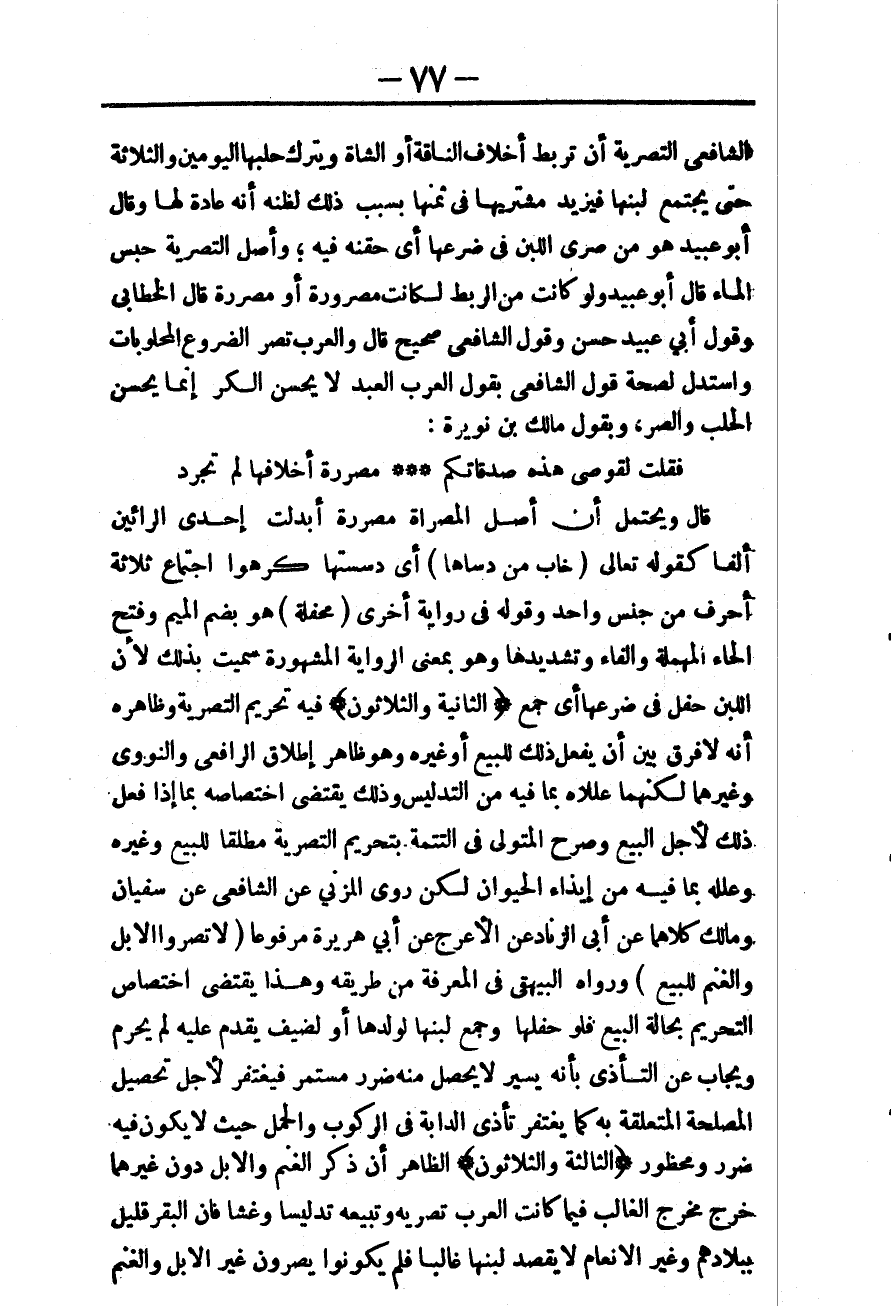 (الثَّالِثَةُ وَالثَّلَاثُونَ) الظَّاهِرُ أَنَّ ذِكْرَ الْغَنَمِ وَالْإِبِلِ دُونَ غَيْرِهِمَا خَرَجَ مَخْرَجَ الْغَالِبِ فِيمَا كَانَتْ الْعَرَبُ تُصَرِّيهِ وَتَبِيعُهُ تَدْلِيسًا وَغِشًّا فَإِنَّ الْبَقَرَ قَلِيلٌ بِبِلَادِهِمْ وَغَيْرُ الْأَنْعَامِ لَا يُقْصَدُ لَبَنُهَا غَالِبًا فَلَمْ يَكُونُوا يَصُرُّونَ غَيْرَ الْإِبِلِ وَالْغَنَمِ