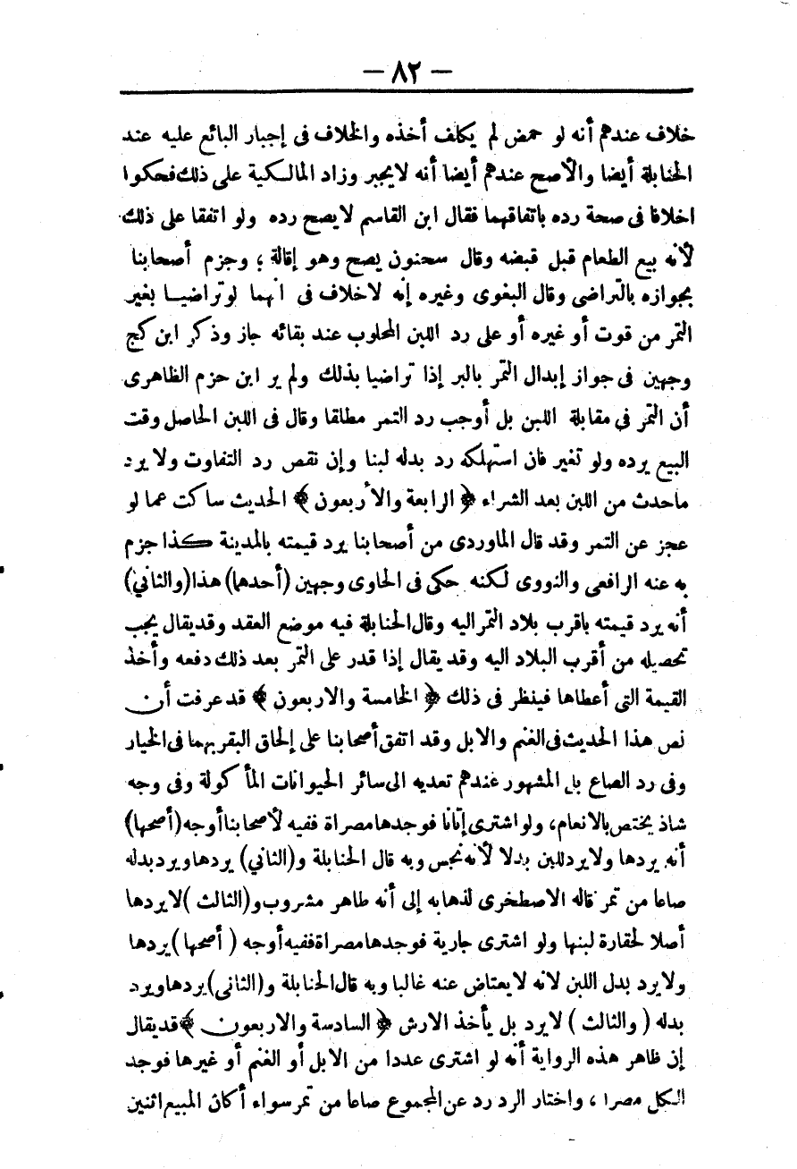 ـــــــــــــــــــــــــــــQخِلَافَ عِنْدَهُمْ أَنَّهُ لَوْ حَمُضَ لَمْ يُكَلَّفْ أَخْذُهُ، وَالْخِلَافُ فِي إخْبَارِ الْبَائِعِ عَلَيْهِ عِنْدَ الْحَنَابِلَةِ أَيْضًا وَالْأَصَحُّ عِنْدَهُمْ أَيْضًا أَنَّهُ لَا يُجْبَرُ وَزَادَ الْمَالِكِيَّةُ عَلَى ذَلِكَ فَحَكَوْا اخْتِلَافًا فِي صِحَّةِ رَدِّهِ بِاتِّفَاقِهِمَا فَقَالَ ابْنُ الْقَاسِمِ: لَا يَصِحُّ رَدُّهُ، وَلَوْ اتَّفَقَا عَلَى ذَلِكَ؛ لِأَنَّهُ بَيْعُ الطَّعَامِ قَبْلَ قَبْضِهِ، وَقَالَ سَحْنُونٌ يَصِحُّ وَهُوَ إقَالَةٌ؛ وَجَزَمَ أَصْحَابُنَا بِجَوَازِهِ بِالتَّرَاضِي وَقَالَ الْبَغَوِيّ وَغَيْرُهُ إنَّهُ لَا خِلَافَ فِي أَنَّهُمَا لَوْ تَرَاضَيَا بِغَيْرِ التَّمْرِ مِنْ قُوتٍ أَوْ غَيْرِهِ أَوْ عَلَى رَدِّ اللَّبَنِ الْمَحْلُوبِ عِنْدَ بَقَائِهِ جَازَ وَذَكَرَ ابْنُ كَجٍّ وَجْهَيْنِ فِي جَوَازِ إبْدَالِ التَّمْرِ بِالْبُرِّ إذَا تَرَاضَيَا بِذَلِكَ، وَلَمْ يَرَ ابْنُ حَزْمٍ الظَّاهِرِيُّ أَنَّ التَّمْرَ فِي مُقَابَلَةِ اللَّبَنِ بَلْ أَوْجَبَ رَدَّ التَّمْرِ مُطْلَقًا، وَقَالَ فِي اللَّبَنِ الْحَاصِلِ وَقْتَ الْبَيْعِ يَرُدُّهُ وَلَوْ تَغَيَّرَ فَإِنْ اسْتَهْلَكَهُ رَدَّ بَدَلَهُ لَبَنًا، وَإِنْ نَقَصَ رَدَّ التَّفَاوُتَ وَلَا يَرُدُّ مَا حَدَثَ مِنْ اللَّبَنِ بَعْدَ الشِّرَاءِ.