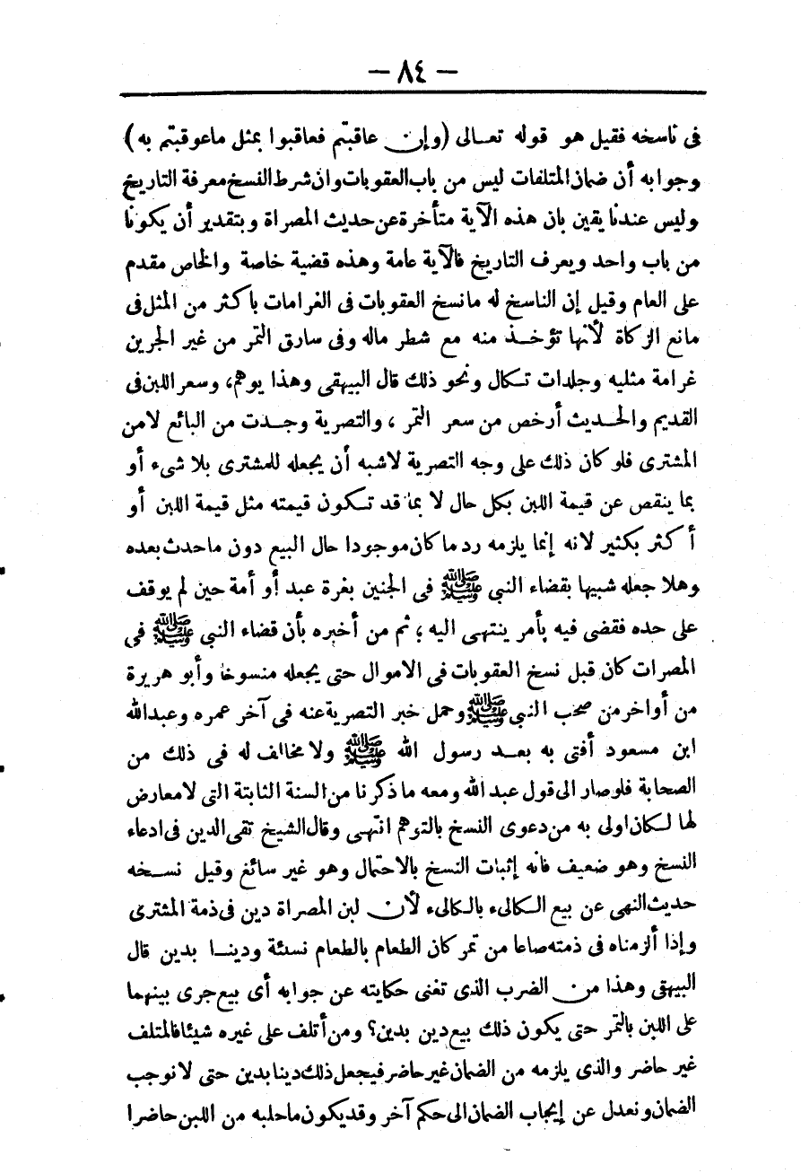 ـــــــــــــــــــــــــــــQفِي نَاسِخِهِ فَقِيلَ هُوَ قَوْله تَعَالَى {وَإِنْ عَاقَبْتُمْ فَعَاقِبُوا بِمِثْلِ مَا عُوقِبْتُمْ بِهِ} [النحل: 126] وَجَوَابُهُ أَنَّ ضَمَانَ الْمُتْلَفَاتِ لَيْسَ مِنْ بَابِ الْعُقُوبَاتِ، وَأَنَّ شَرْطَ النَّسْخِ مَعْرِفَةُ التَّارِيخِ وَلَيْسَ عِنْدَنَا يَقِينٌ بِأَنَّ هَذِهِ الْآيَةَ مُتَأَخِّرَةٌ عَنْ حَدِيثِ الْمُصَرَّاةِ وَبِتَقْدِيرِ أَنْ يَكُونَا مِنْ بَابٍ وَاحِدٍ وَيُعْرَفُ التَّارِيخُ فَالْآيَةُ عَامَّةٌ وَهَذِهِ قَضِيَّةٌ خَاصَّةٌ وَالْخَاصُّ مُقَدَّمٌ عَلَى الْعَامِّ وَقِيلَ: إنَّ النَّاسِخَ لَهُ مَا نَسَخَ الْعُقُوبَاتِ فِي الْغَرَامَاتِ بِأَكْثَرَ مِنْ الْمِثْلِ فِي مَانِعِ الزَّكَاةِ؛ لِأَنَّهَا تُؤْخَذُ مِنْهُ مَعَ شَطْرِ مَالِهِ، وَفِي سَارِقِ التَّمْرِ مِنْ غَيْرِ الْجَرِينِ غَرَامَةٌ مِثْلِيَّةٌ وَجَلَدَاتٌ تُكَالُ وَنَحْوُ ذَلِكَ قَالَ الْبَيْهَقِيُّ وَهَذَا يُوهِمُ، وَسِعْرُ اللَّبَنِ فِي الْقَدِيمِ وَالْحَدِيثِ أَرْخَصُ مِنْ سِعْرِ التَّمْرِ، وَالتَّصْرِيَةُ وُجِدَتْ مِنْ الْبَائِعِ لَا مِنْ الْمُشْتَرِي فَلَوْ كَانَ ذَلِكَ عَلَى وَجْهِ التَّصْرِيَةِ لَأَشْبَهَ أَنْ يَجْعَلَهُ لِلْمُشْتَرِي بِلَا شَيْءٍ أَوْ بِمَا يَنْقُصُ عَنْ قِيمَةِ اللَّبَنِ بِكُلِّ حَالٍ لَا بِمَا قَدْ تَكُونُ قِيمَتُهُ مِثْلَ قِيمَةِ اللَّبَنِ أَوْ أَكْثَرَ بِكَثِيرٍ؛ لِأَنَّهُ إنَّمَا يَلْزَمُهُ رَدُّ مَا كَانَ مَوْجُودًا حَالَ الْبَيْعِ دُونَ مَا حَدَثَ بَعْدَهُ وَهَلَّا جَعَلَهُ شَبِيهًا بِقَضَاءِ النَّبِيِّ - صَلَّى اللَّهُ عَلَيْهِ وَسَلَّمَ - فِي الْجَنِينِ بِغُرَّةِ عَبْدٍ أَوْ أَمَةٍ حِينَ لَمْ يُوقَفْ عَلَى حَدِّهِ فَقَضَى فِيهِ بِأَمْرٍ يَنْتَهِي إلَيْهِ؛ ثُمَّ مَنْ أَخْبَرَهُ بِأَنَّ قَضَاءَ النَّبِيِّ - صَلَّى اللَّهُ عَلَيْهِ وَسَلَّمَ - فِي الْمُصَرَّاةِ كَانَ قَبْلَ نَسْخِ الْعُقُوبَاتِ فِي الْأَمْوَالِ حَتَّى يَجْعَلَهُ مَنْسُوخًا، وَأَبُو هُرَيْرَةَ مِنْ أَوَاخِرِ مَنْ صَحِبَ النَّبِيَّ - صَلَّى اللَّهُ عَلَيْهِ وَسَلَّمَ - وَحَمَلَ خَبَرَ التَّصْرِيَةِ عَنْهُ فِي آخَرِ عُمُرِهِ وَعَبْدُ اللَّهِ بْنُ مَسْعُودٍ أَفْتَى بِهِ بَعْدَ رَسُولِ اللَّهِ - صَلَّى اللَّهُ عَلَيْهِ وَسَلَّمَ - وَلَا مُخَالِفَ لَهُ فِي ذَلِكَ مِنْ الصَّحَابَةِ فَلَوْ صَارَ إلَى قَوْلِ عَبْدِ اللَّهِ وَمَعَهُ مَا ذَكَرْنَا مِنْ السُّنَّةِ الثَّابِتَةِ الَّتِي لَا مُعَارِضَ لَهَا لَكَانَ أَوْلَى بِهِ مِنْ دَعْوَى النَّسْخِ بِالتَّوَهُّمِ. انْتَهَى.