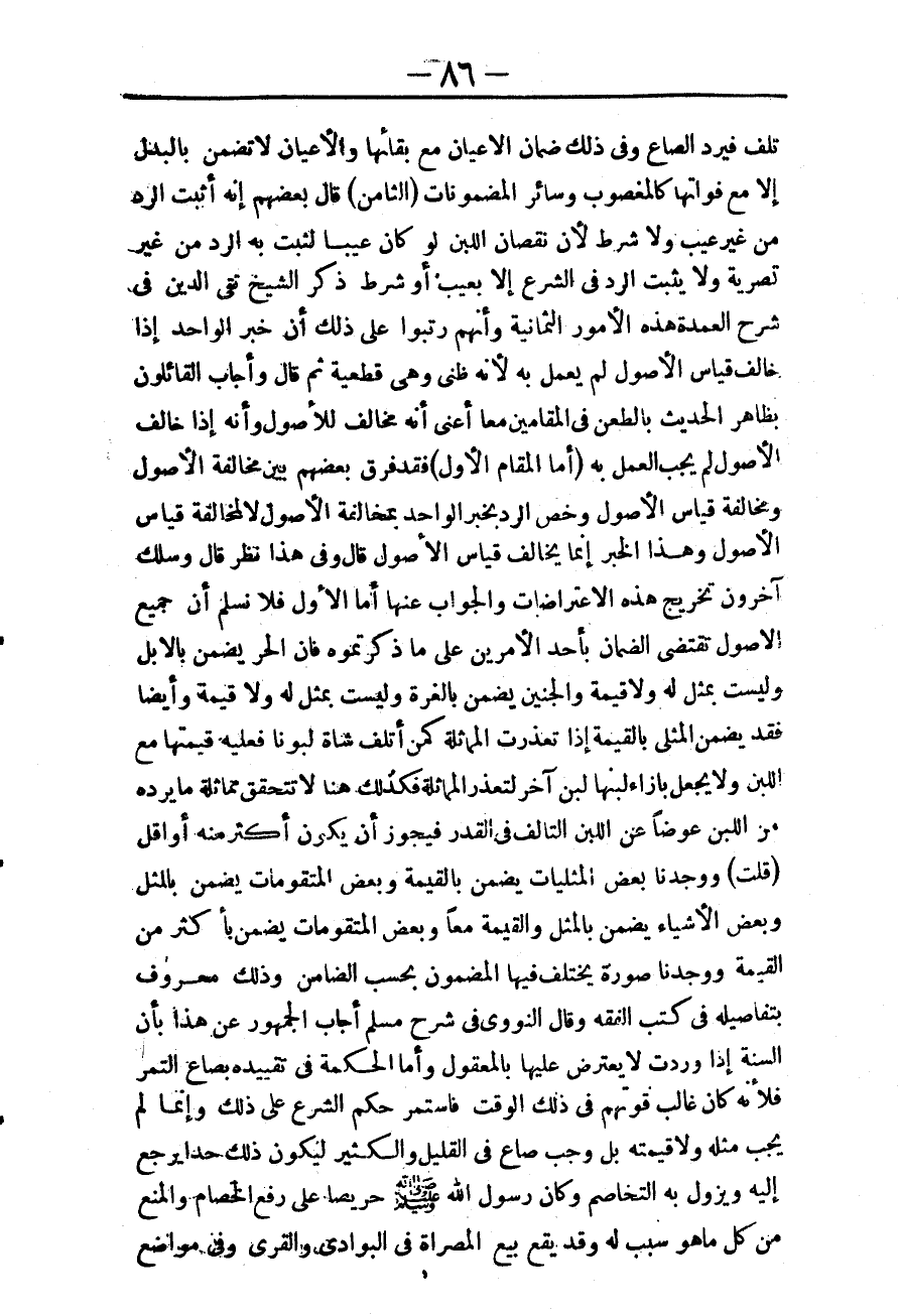 (قُلْتُ) وَوَجَدْنَا بَعْضَ الْمِثْلِيَّاتِ يُضْمَنُ بِالْقِيمَةِ وَبَعْضَ الْمُتَقَوِّمَاتِ يُضْمَنُ بِالْمِثْلِ وَبَعْضُ الْأَشْيَاءِ يُضْمَنُ بِالْمِثْلِ وَالْقِيمَةِ مَعًا وَبَعْضُ الْمُتَقَوِّمَاتِ يُضْمَنُ بِأَكْثَرَ مِنْ الْقِيمَةِ وَوَجَدْنَا صُورَةً يَخْتَلِفُ فِيهَا الْمَضْمُونُ بِحَسَبِ الضَّامِنِ، وَذَلِكَ مَعْرُوفٌ بِتَفَاصِيلِهِ فِي كُتُبِ الْفِقْهِ. وَقَالَ النَّوَوِيُّ فِي شَرْحِ مُسْلِمٍ: أَجَابَ الْجُمْهُورُ عَنْ هَذَا بِأَنَّ السُّنَّةَ إذَا وَرَدَتْ لَا يُعْتَرَضُ عَلَيْهَا بِالْمَعْقُولِ.