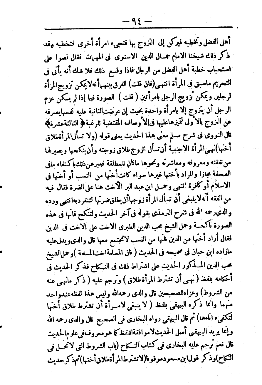 وَرَدَّهُ وَالِدِي - رَحِمَهُ اللَّهُ - فِي شَرْحِ التِّرْمِذِيِّ بِقَوْلِهِ فِي آخِرِ الْحَدِيثِ وَلْتَنْكِحْ فَإِنَّهَا فِي هَذِهِ الصُّورَةِ نَاكِحَةً وَحَمَلَ الشَّيْخُ مُحِبُّ الدِّينِ الطَّبَرِيُّ الْأُخْتَ عَلَى الْأُخْتِ فِي الدِّينِ فَقَالَ أَرَادَ أُخْتَهَا مِنْ الدِّينِ فَإِنَّهَا مِنْ النَّسَبِ لَا تَجْتَمِعُ مَعَهَا قَالَ وَالِدِي: وَيَدُلُّ عَلَيْهِ مَا زَادَهُ ابْنُ حِبَّانَ فِي صَحِيحِهِ فِي الْحَدِيثِ (فَإِنَّ الْمُسْلِمَةَ أُخْتُ الْمُسْلِمَةِ) وَحَمَلَ الشَّيْخُ مُحِبُّ الدِّينِ الْمَذْكُورُ الْحَدِيثَ عَلَى اشْتِرَاطِ ذَلِكَ فِي النِّكَاحِ فَذَكَرَ الْحَدِيثَ فِي أَحْكَامِهِ بِلَفْظِ (نَهَى أَنْ تَشْتَرِطَ الْمَرْأَةُ طَلَاقَ) وَتَرْجَمَ عَلَيْهِ (ذِكْرُ مَا نُهِيَ عَنْهُ مِنْ الشُّرُوطِ) وَعَزَاهُ لِلصَّحِيحَيْنِ. قَالَ وَالِدِي - رَحِمَهُ اللَّهُ -: وَلَيْسَ هَذَا لَفْظَهُ عِنْدَ وَاحِدٍ مِنْهُمَا، وَإِنَّمَا ذَكَرَهُ الْبَيْهَقِيُّ بِلَفْظِ «لَا يَنْبَغِي لِامْرَأَةٍ أَنْ تَشْتَرِطَ طَلَاقَ أُخْتِهَا لِتُكْفِئَ إنَاءَهَا» ثُمَّ قَالَ الْبَيْهَقِيُّ رَوَاهُ الْبُخَارِيُّ فِي الصَّحِيحِ. قَالَ وَالِدِي - رَحِمَهُ اللَّهُ -: وَإِنَّمَا يُرِيدُ الْبَيْهَقِيُّ أَصْلَ الْحَدِيثِ لَا مُوَافَقَةَ اللَّفْظِ كَمَا هُوَ مَعْرُوفٌ فِي عُلُومِ الْحَدِيثِ قَالَ: نَعَمْ تَرْجَمَ عَلَيْهِ الْبُخَارِيُّ فِي كِتَابِ النِّكَاحِ (بَابُ الشُّرُوطِ الَّتِي لَا تَحِلُّ فِي النِّكَاحِ) وَذَكَرَ قَوْلَ ابْنِ مَسْعُودٍ مَوْقُوفًا (لَا تَشْتَرِطْ الْمَرْأَةُ طَلَاقَ أُخْتِهَا) ثُمَّ ذَكَرَ حَدِيثَ