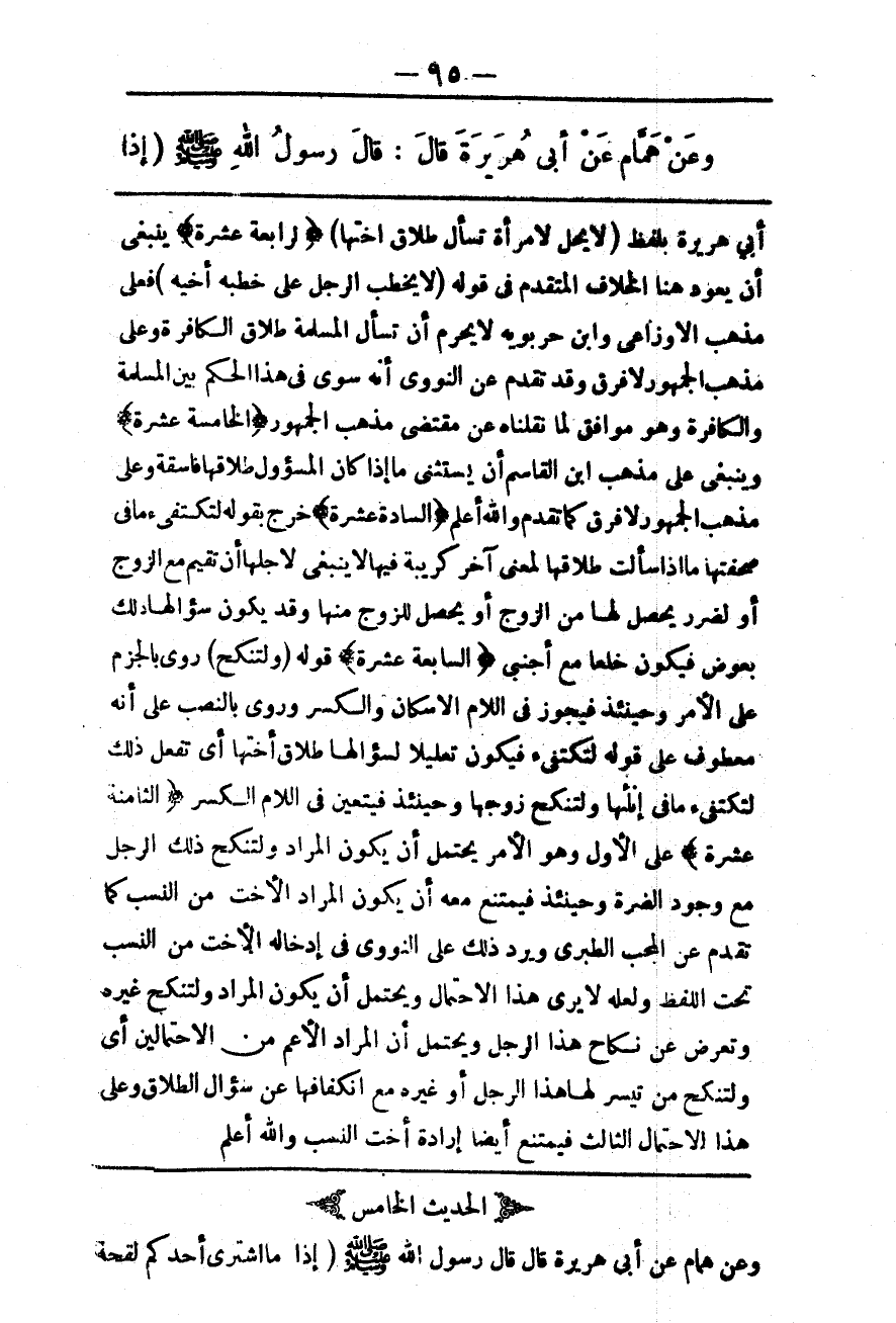 (الثَّامِنَةَ عَشْرَةَ) عَلَى الْأَوَّلِ وَهُوَ الْأَمْرُ يَحْتَمِلُ أَنْ يَكُونَ الْمُرَادُ وَلْتَنْكِحْ ذَلِكَ الرَّجُلَ مَعَ وُجُودِ الضَّرَّةِ وَحِينَئِذٍ فَيَمْتَنِعُ مَعَهُ أَنْ يَكُونَ الْمُرَادُ الْأُخْتَ مِنْ النَّسَبِ كَمَا تَقَدَّمَ عَنْ الْمُحِبِّ الطَّبَرِيِّ وَيُرَدُّ ذَلِكَ عَلَى النَّوَوِيِّ فِي إدْخَالِهِ الْأُخْتَ مِنْ النَّسَبِ تَحْتَ اللَّفْظِ وَلَعَلَّهُ لَا يَرَى هَذَا الِاحْتِمَالَ وَيَحْتَمِلُ أَنْ يَكُونَ الْمُرَادُ وَلْتَنْكِحْ غَيْرَهُ وَتُعْرِضْ عَنْ نِكَاحِ هَذَا الرَّجُلِ وَيَحْتَمِلُ أَنَّ الْمُرَادَ الْأَعَمُّ مِنْ الِاحْتِمَالَيْنِ أَيْ وَلْتَنْكِحْ مَنْ تَيَسَّرَ لَهَا هَذَا الرَّجُلَ أَوْ غَيْرَهُ مَعَ انْكِفَافِهَا عَنْ سُؤَالِ الطَّلَاقِ وَعَلَى هَذَا الِاحْتِمَالِ الثَّالِثِ فَيَمْتَنِعُ أَيْضًا إرَادَةُ أُخْتِ النَّسَبِ وَاَللَّهُ أَعْلَمُ.