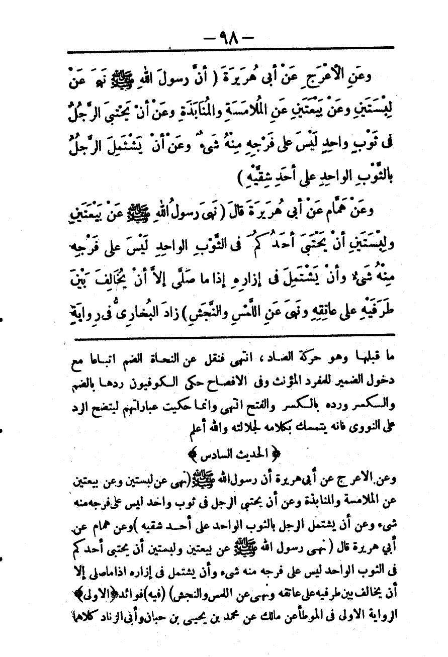 (الْحَدِيثُ السَّادِسُ) وَعَنْ الْأَعْرَجِ عَنْ أَبِي هُرَيْرَةَ أَنَّ رَسُولَ اللَّهِ - صَلَّى اللَّهُ عَلَيْهِ وَسَلَّمَ - «نَهَى عَنْ لِبْسَتَيْنِ وَعَنْ بَيْعَتَيْنِ عَنْ الْمُلَامَسَةِ وَالْمُنَابَذَةِ وَعَنْ أَنْ يَحْتَبِيَ الرَّجُلُ فِي ثَوْبٍ وَاحِدٍ لَيْسَ عَلَى فَرْجِهِ مِنْهُ شَيْءٌ وَعَنْ أَنْ يَشْتَمِلَ الرَّجُلُ بِالثَّوْبِ الْوَاحِدِ عَلَى أَحَدِ شِقَّيْهِ» وَعَنْ هَمَّامٍ عَنْ أَبِي هُرَيْرَةَ قَالَ «نَهَى رَسُولُ اللَّهِ - صَلَّى اللَّهُ عَلَيْهِ وَسَلَّمَ - عَنْ بَيْعَتَيْنِ وَلِبْسَتَيْنِ أَنْ يَحْتَبِيَ أَحَدُكُمْ فِي الثَّوْبِ الْوَاحِدِ لَيْسَ عَلَى فَرْجِهِ مِنْهُ شَيْءٌ، وَأَنْ يَشْتَمِلَ فِي إزَارِهِ إذَا مَا صَلَّى إلَّا أَنْ يُخَالِفَ بَيْنَ طَرَفَيْهِ عَلَى عَاتِقِهِ وَنَهَى عَنْ اللَّمْسِ وَالنَّجْشِ» .