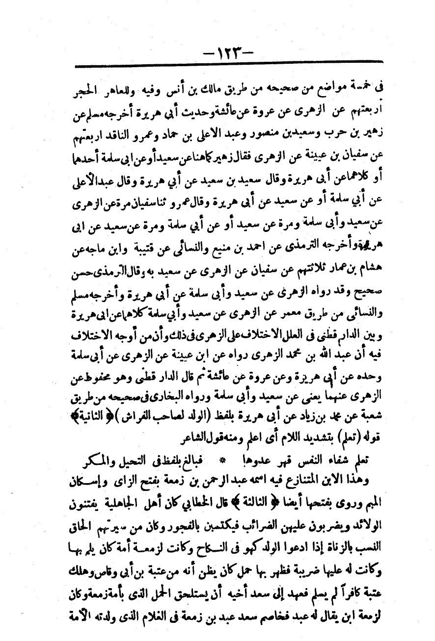 وَقَالَ التِّرْمِذِيُّ حَسَنٌ صَحِيحٌ، وَقَدْ رَوَاهُ الزُّهْرِيُّ عَنْ سَعِيدٍ، وَأَبِي سَلَمَةَ عَنْ أَبِي هُرَيْرَةَ، وَأَخْرَجَهُ مُسْلِمٌ، وَالنَّسَائِيُّ مِنْ طَرِيقِ مَعْمَرٍ عَنْ الزُّهْرِيِّ عَنْ سَعِيدٍ، وَأَبِي سَلَمَةَ كِلَاهُمَا عَنْ أَبِي هُرَيْرَةَ، وَبَيَّنَ الدَّارَقُطْنِيُّ فِي الْعِلَلِ الِاخْتِلَافَ عَلَى الزُّهْرِيِّ فِي ذَلِكَ، وَأَنَّ مِنْ أَوْجُهِ الِاخْتِلَافِ فِيهِ أَنَّ عَبْدَ اللَّهِ بْنَ مُحَمَّدٍ الزُّهْرِيَّ رَوَاهُ عَنْ ابْنِ عُيَيْنَةَ عَنْ الزُّهْرِيِّ عَنْ أَبِي سَلَمَةَ وَحْدَهُ عَنْ أَبِي هُرَيْرَةَ، وَعَنْ عُرْوَةَ عَنْ عَائِشَةَ ثُمَّ قَالَ الدَّارَقُطْنِيُّ، وَهُوَ مَحْفُوظٌ عَنْ الزُّهْرِيِّ عَنْهُمَا يَعْنِي عَنْ سَعِيدٍ، وَأَبِي سَلَمَةَ، وَرَوَاهُ الْبُخَارِيُّ فِي صَحِيحِهِ مِنْ طَرِيقِ شُعْبَةَ عَنْ مُحَمَّدِ بْنِ زِيَادٍ عَنْ أَبِي هُرَيْرَةَ بِلَفْظِ «الْوَلَدُ لِصَاحِبِ الْفِرَاشِ» .