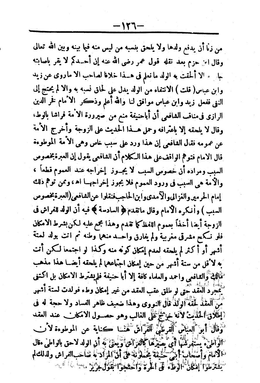 وَذَكَرَ الْإِمَامُ فَخْرُ الدِّينِ الرَّازِيّ فِي مَنَاقِبِ الشَّافِعِيِّ أَنَّ أَبَا حَنِيفَةَ مَنَعَ مِنْ صَيْرُورَةِ الْأَمَةِ فِرَاشًا بِالْوَطْءِ، وَقَالَ لَا يَلْحَقُهُ إلَّا بِاعْتِرَافِهِ، وَحَمَلَ هَذَا الْحَدِيثَ عَلَى الزَّوْجَةِ، وَأَخْرَجَ الْأَمَةَ عَنْ عُمُومِهِ فَقَالَ الشَّافِعِيُّ إنَّ هَذَا وَرَدَ عَلَى سَبَبٍ خَاصٍّ، وَهِيَ الْأَمَةُ الْمَوْطُوءَةُ.