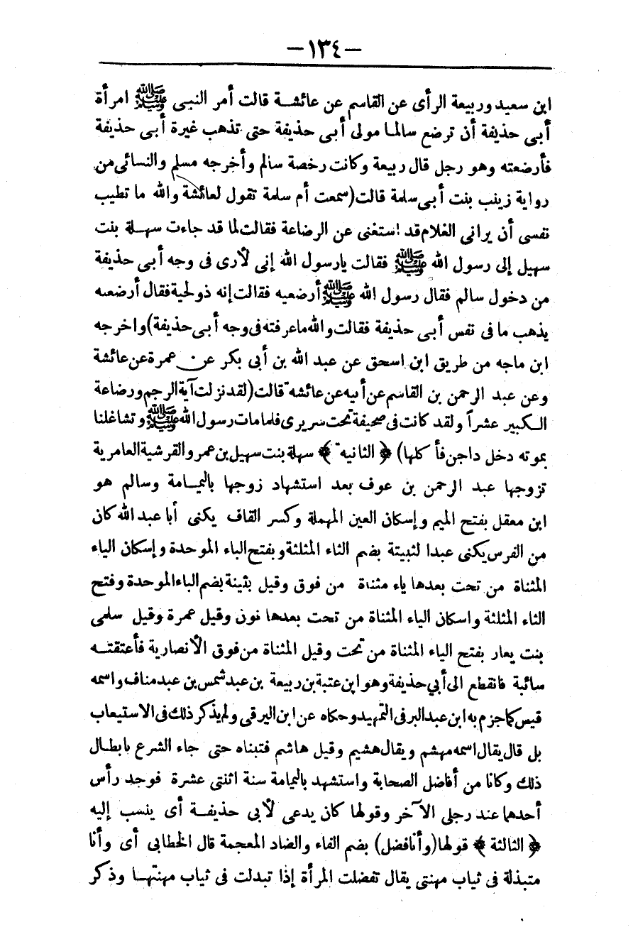 (الثَّانِيَةُ) سَهْلَةُ بِنْتُ سُهَيْلِ بْنِ عَمْرٍو الْقُرَشِيَّةُ الْعَامِرِيَّةُ تَزَوَّجَهَا عَبْدُ الرَّحْمَنِ بْنُ عَوْفٍ بَعْدَ اسْتِشْهَادِ زَوْجِهَا بِالْيَمَامَةِ، وَسَالِمٌ هُوَ ابْنُ مَعْقِلٍ بِفَتْحِ الْمِيمِ، وَإِسْكَانِ الْعَيْنِ الْمُهْمَلَةِ، وَكَسْرِ الْقَافِ يُكَنَّى أَبَا عَبْدِ اللَّهِ كَانَ مِنْ الْفُرْسِ يُكَنَّى عَبْدًا لِثُبَيْتَةَ بِضَمِّ الثَّاءِ الْمُثَلَّثَةِ، وَبِفَتْحِ الْبَاءِ الْمُوَحَّدَةِ، وَإِسْكَانِ الْيَاءِ الْمُثَنَّاةِ مِنْ تَحْتِ بَعْدَهَا يَاءٌ مُثَنَّاةٌ مِنْ فَوْقُ. وَقِيلَ: بُثَيْنَةُ بِضَمِّ الْبَاءِ الْمُوَحَّدَةِ، وَفَتْحِ الثَّاءِ الْمُثَلَّثَةِ، وَإِسْكَانِ الْيَاءِ الْمُثَنَّاةِ مِنْ تَحْتُ بَعْدَهَا نُونٌ، وَقِيلَ عَمْرَةُ، وَقِيلَ سَلْمَى بِنْتُ يَعَارٍ بِفَتْحِ الْيَاءِ الْمُثَنَّاةِ مِنْ تَحْتُ، وَقِيلَ الْمُثَنَّاةُ مِنْ فَوْقُ الْأَنْصَارِيَّةُ فَأَعْتَقَتْ سَائِبَةً فَانْقَطَعَ إلَى أَبِي حُذَيْفَةَ، وَهُوَ ابْنُ عُتْبَةَ بْنِ رَبِيعَةَ بْنِ عَبْدِ شَمْسِ بْنِ عَبْدِ مَنَافٍ، وَاسْمُهُ قَيْسٌ كَمَا جَزَمَ بِهِ ابْنُ عَبْدِ الْبَرِّ فِي التَّمْهِيدِ، وَحَكَاهُ عَنْ ابْنِ الْيَرَقِيِّ، وَلَمْ يَذْكُرْ ذَلِكَ فِي الِاسْتِيعَابِ بَلْ قَالَ يُقَالُ اسْمُهُ مِهْشَمٌ، وَيُقَالُ هُشَيْمِ وَقِيلَ هَاشِمٌ فَتَبَنَّاهُ حَتَّى جَاءَ الشَّرْعُ بِإِبْطَالِ ذَلِكَ، وَكَانَا مِنْ أَفَاضِلِ الصَّحَابَةِ، وَاسْتُشْهِدَا بِالْيَمَامَةِ سَنَةَ اثْنَتَيْ عَشْرَةَ فَوُجِدَ رَأْسُ أَحَدِهِمَا عِنْدَ رِجْلَيْ الْآخَرِ، وَقَوْلُهَا كَانَ يُدْعَى لِأَبِي حُذَيْفَةَ أَيْ يُنْسَبَ إلَيْهِ.