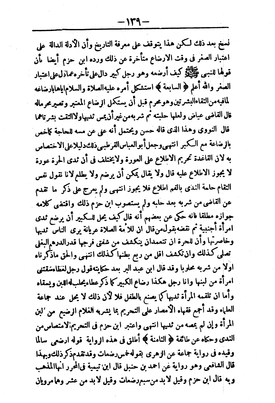 وَلَمْ يُعَرِّجْ عَلَى ذِكْرِ مَا تَقَدَّمَ عَنْ الْقَاضِي مِنْ شُرْبِهِ بَعْدَ حَلْبِهِ، وَلَمْ يَسْتَصْوِبْ ابْنُ حَزْمٍ ذَلِكَ، وَاقْتَضَى كَلَامُهُ جَوَازَهُ مُطْلَقًا فَإِنَّهُ حَكَى عَنْ بَعْضِهِمْ أَنَّهُ قَالَ كَيْفَ يَحِلُّ لِلْكَبِيرِ أَنْ يَرْضَعَ ثَدْيَ امْرَأَةٍ أَجْنَبِيَّةٍ ثُمَّ نَقَضَهُ بِقَوْلِ مَنْ قَالَ إنَّ لِلْأَمَةِ الصَّلَاةَ عُرْيَانَةً يَرَى النَّاسُ ثَدْيَهَا، وَخَاصِرَتَهَا، وَأَنَّ لِلْحُرَّةِ أَنْ تَتَعَمَّدَ أَنْ يَنْكَشِفَ مِنْ شَفَتَيْ فَرْجِهَا قَدْرَ الدِّرْهَمِ الْبَغْلِيِّ تُصَلِّي كَذَلِكَ، وَإِنْ تَكَشَّفَ أَقَلُّ مِنْ رُبْعِ بَطْنِهَا كَذَلِكَ انْتَهَى، وَالْحَقُّ مَا ذَكَرْنَاهُ أَوَّلًا مِنْ شُرْبِهِ مَحْلُوبًا، وَقَدْ قَالَ ابْنُ عَبْدِ الْبَرِّ بَعْدَ حِكَايَتِهِ قَوْلَ رَجُلٍ لِعَطَاءٍ سَقَتْنِي امْرَأَةٌ مِنْ لَبَنِهَا، وَأَنَا رَجُلٌ هَكَذَا رَضَاعَ الْكَبِيرِ كَمَا ذَكَرَ عَطَاءٌ يُحْلَبُ لَهُ اللَّبَنُ، وَيُسْقَاهُ، وَأَمَّا أَنْ تُلْقِمَهُ الْمَرْأَةُ ثَدْيَهَا كَمَا يُصْنَعُ بِالطِّفْلِ فَلَا؛ لِأَنَّ ذَلِكَ لَا يَحِلُّ عِنْدَ جَمَاعَةِ الْعُلَمَاءِ.