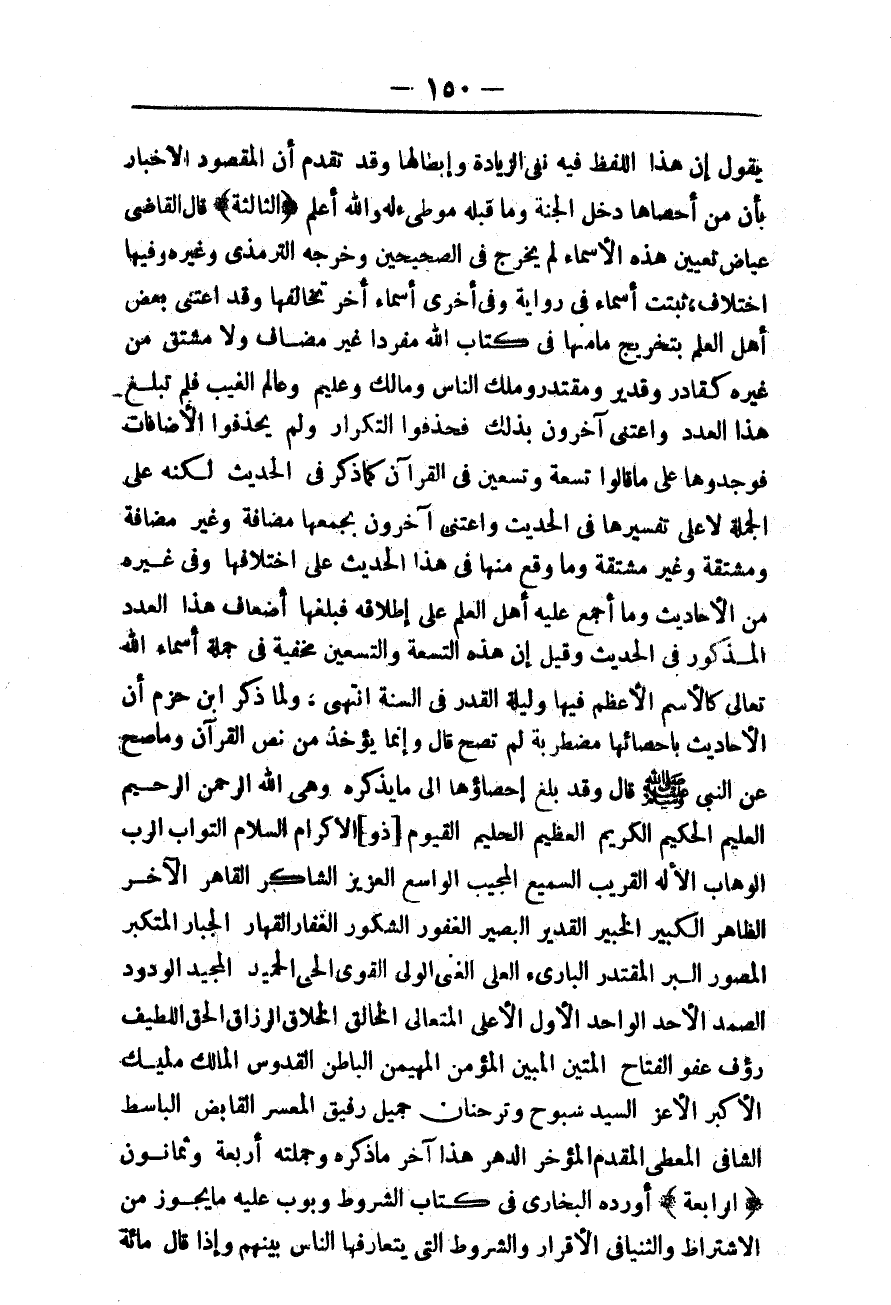 وَلَمَّا ذَكَرَ ابْنُ حَزْمٍ أَنَّ الْأَحَادِيثَ بِإِحْصَائِهَا مُضْطَرِبَةٌ لَمْ تَصِحْ قَالَ: وَإِنَّمَا يُؤْخَذُ مِنْ نَصِّ الْقُرْآنِ، وَمَا صَحَّ عَنْ النَّبِيِّ - صَلَّى اللَّهُ عَلَيْهِ وَسَلَّمَ - قَالَ: وَقَدْ بَلَغَ إحْصَاؤُهَا إلَى مَا يَذْكُرُهُ، وَهِيَ اللَّهُ الرَّحْمَنُ الرَّحِيمُ الْعَلِيمُ الْحَكِيمُ الْكَرِيمُ الْعَظِيمُ الْحَلِيمُ الْقَيُّومُ [ذُو] الْإِكْرَامِ السَّلَامُ التَّوَّابُ الرَّبُّ الْوَهَّابُ الْإِلَهُ الْقَرِيبُ السَّمِيعُ الْمُجِيبُ الْوَاسِعُ الْعَزِيزُ الشَّاكِرُ الْقَاهِرُ الْآخَرُ الظَّاهِرُ الْكَبِيرُ الْخَبِيرُ الْقَدِيرُ الْبَصِيرُ الْغَفُورُ الشَّكُورُ الْغَفَّارُ الْقَهَّارُ الْجَبَّارُ الْمُتَكَبِّرُ الْمُصَوِّرُ الْبَرُّ الْمُقْتَدِرُ الْبَارِئُ الْعَلِيُّ الْغَنِيُّ الْوَلِيُّ الْقَوِيُّ الْحَيُّ الْحَمِيدُ الْمَجِيدُ الْوَدُودُ الصَّمَدُ الْأَحَدُ الْوَاحِدُ الْأَوَّلُ الْأَعْلَى الْمُتَعَالِي الْخَالِقُ الْخَلَّاقُ الرَّزَّاقُ الْحَقُّ اللَّطِيفُ رَءُوفٌ عَفُوٌّ الْفَتَّاحُ الْمَتِينُ الْمُبِينُ الْمُؤْمِنُ الْمُهَيْمِنُ الْبَاطِنُ الْقُدُّوسُ الْمَالِكُ مَلِيكٌ الْأَكْبَرُ الْأَعَزُّ السَّيِّدُ سُبُّوحٌ وِتْرٌ حَنَّانٌ جَمِيلٌ رَفِيقٌ الْمُيَسِّرُ الْقَابِضُ الْبَاسِطُ الشَّافِي الْمُعْطِي الْمُقَدِّمُ الْمُؤَخِّرُ الدَّهْرُ هَذَا آخَرُ مَا ذَكَرَهُ، وَجُمْلَتُهُ أَرْبَعَةٌ وَثَمَانُونَ.