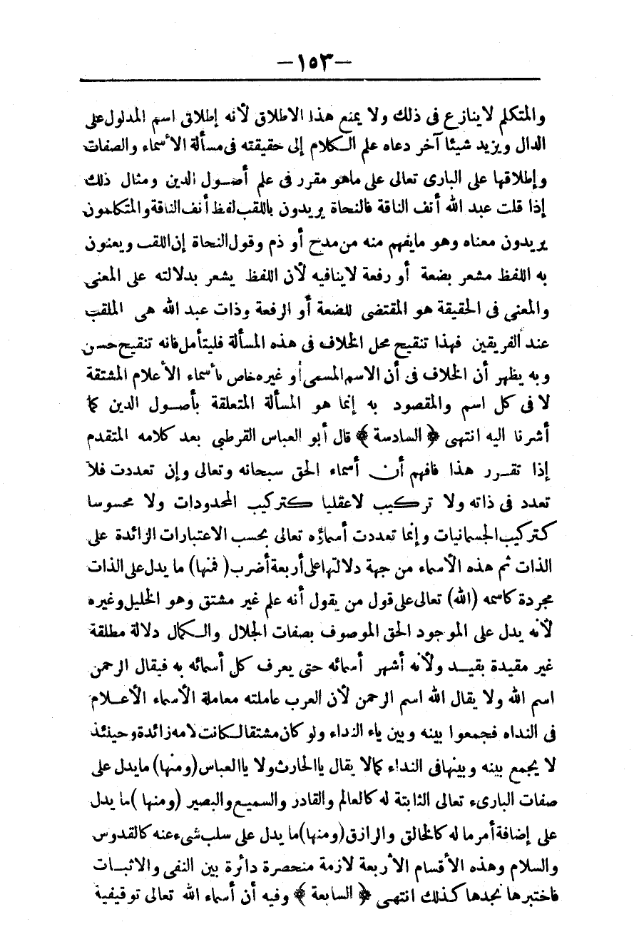(السَّادِسَةُ) قَالَ أَبُو الْعَبَّاسِ الْقُرْطُبِيُّ بَعْدَ كَلَامِهِ الْمُتَقَدِّمِ إذَا تَقَرَّرَ هَذَا فَافْهَمْ أَنَّ أَسْمَاءَ الْحَقِّ سُبْحَانَهُ وَتَعَالَى وَإِنْ تَعَدَّدَتْ فَلَا تَعَدُّدَ فِي ذَاتِهِ، وَلَا تَرْكِيبَ لَا عَقْلِيًّا كَتَرْكِيبِ الْمَحْدُودَاتِ، وَلَا مَحْسُوسًا كَتَرْكِيبِ الْجُسْمَانِيَّاتِ، وَإِنَّمَا تَعَدَّدَتْ أَسْمَاؤُهُ تَعَالَى بِحَسَبِ الِاعْتِبَارَاتِ الزَّائِدَةِ عَلَى الذَّاتِ ثُمَّ هَذِهِ الْأَسْمَاءُ مِنْ جِهَةِ دَلَالَتِهَا عَلَى أَرْبَعَةِ أَضْرُبٍ (فَمِنْهَا) مَا يَدُلُّ عَلَى الذَّاتِ مُجَرَّدَةً كَاسْمِهِ (اللَّهُ) تَعَالَى عَلَى قَوْلِ مَنْ يَقُولُ أَنَّهُ عَلَمٌ غَيْرُ مُشْتَقٍّ، وَهُوَ الْخَلِيلُ، وَغَيْرُهُ لِأَنَّهُ يَدُلُّ عَلَى الْمَوْجُودِ الْحَقِّ الْمَوْصُوفِ بِصِفَاتِ الْجَلَالِ وَالْكَمَالِ دَلَالَةً مُطْلَقَةً غَيْرَ مُقَيَّدَةٍ بِقَيْدٍ، وَلِأَنَّهُ أَشْهَرُ أَسْمَائِهِ حَتَّى يُعْرَفَ كُلُّ أَسْمَائِهِ بِهِ فَيُقَالَ الرَّحْمَنُ اسْمُ اللَّهِ، وَلَا يُقَالُ اللَّهُ اسْمُ الرَّحْمَنِ لِأَنَّ الْعَرَبَ عَامَلَتْهُ مُعَامَلَةَ الْأَسْمَاءِ الْأَعْلَامِ فِي النِّدَاءِ فَجَمَعُوا بَيْنَهُ وَبَيْنَ يَاءِ النِّدَاءِ، وَلَوْ كَانَ مُشْتَقًّا لَكَانَتْ لَامُهُ زَائِدَةً، وَحِينَئِذٍ لَا يُجْمَعُ بَيْنَهُ وَبَيْنَهَا فِي النِّدَاءِ كَمَا لَا يُقَالُ يَا الْحَارِثُ، وَلَا يَا الْعَبَّاسُ (وَمِنْهَا) مَا يَدُلُّ عَلَى صِفَاتِ الْبَارِئِ تَعَالَى الثَّابِتَةِ لَهُ كَالْعَالِمِ، وَالْقَادِرِ، وَالسَّمِيعِ، وَالْبَصِيرِ (وَمِنْهَا) مَا يَدُلُّ عَلَى إضَافَةِ أَمْرٍ مَا لَهُ كَالْخَالِقِ، وَالرَّازِقِ (وَمِنْهَا) مَا يَدُلُّ عَلَى سَلْبِ شَيْءٍ عَنْهُ كَالْقُدُّوسِ وَالسَّلَامِ، وَهَذِهِ الْأَقْسَامُ الْأَرْبَعَةُ لَازِمَةٌ مُنْحَصِرَةٌ دَائِرَةٌ بَيْنَ النَّفْيِ وَالْإِثْبَاتِ فَاخْتَبِرْهَا تَجِدْهَا كَذَلِكَ انْتَهَى.