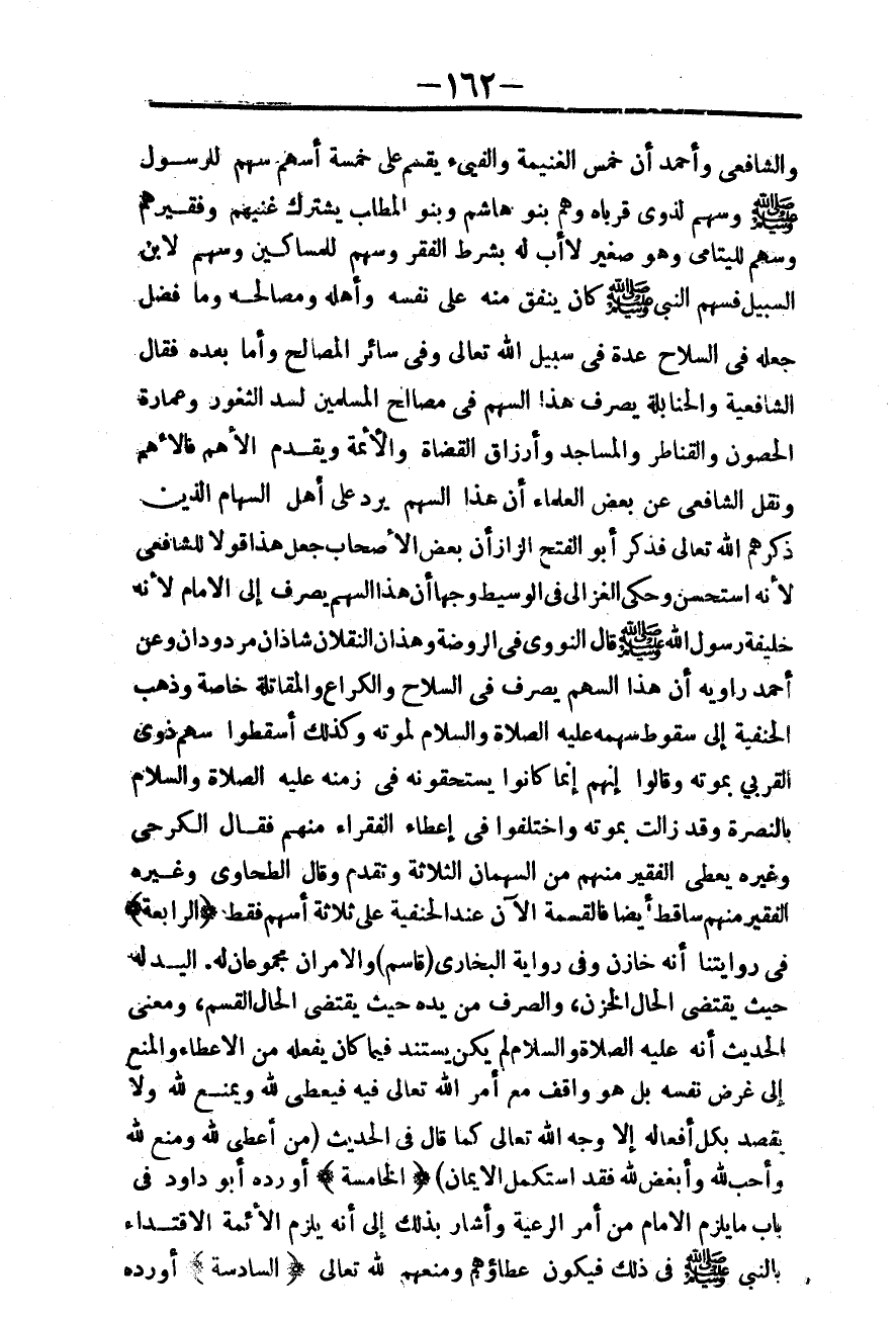 ـــــــــــــــــــــــــــــQوَالشَّافِعِيِّ وَأَحْمَدَ أَنَّ خُمُسَ الْغَنِيمَةِ وَالْفَيْءِ يُقَسَّمُ عَلَى خَمْسَةِ أَسْهُمٍ: سَهْمٍ لِلرَّسُولِ - صَلَّى اللَّهُ عَلَيْهِ وَسَلَّمَ -، وَسَهْمٍ لِذَوِي قَرَّبَاهُ، وَهُمْ بَنُو هَاشِمٍ وَبَنُو الْمُطَّلِبِ يَشْتَرِكُ غَنِيُّهُمْ وَفَقِيرُهُمْ، وَسَهْمٍ لِلْيَتَامَى وَهُوَ صَغِيرٌ لَا أَبَ لَهُ بِشَرْطِ الْفَقْرِ، وَسَهْمٍ لِلْمَسَاكِينِ، وَسَهْمٍ لِابْنِ السَّبِيلِ. فَسَهْمُ النَّبِيِّ - صَلَّى اللَّهُ عَلَيْهِ وَسَلَّمَ - كَانَ يُنْفِقُ مِنْهُ عَلَى نَفْسِهِ وَأَهْلِهِ وَمَصَالِحِهِ، وَمَا فَضَلَ جَعَلَهُ فِي السِّلَاحِ عُدَّةً فِي سَبِيلِ اللَّهِ تَعَالَى، وَفِي سَائِرِ الْمَصَالِحِ.
