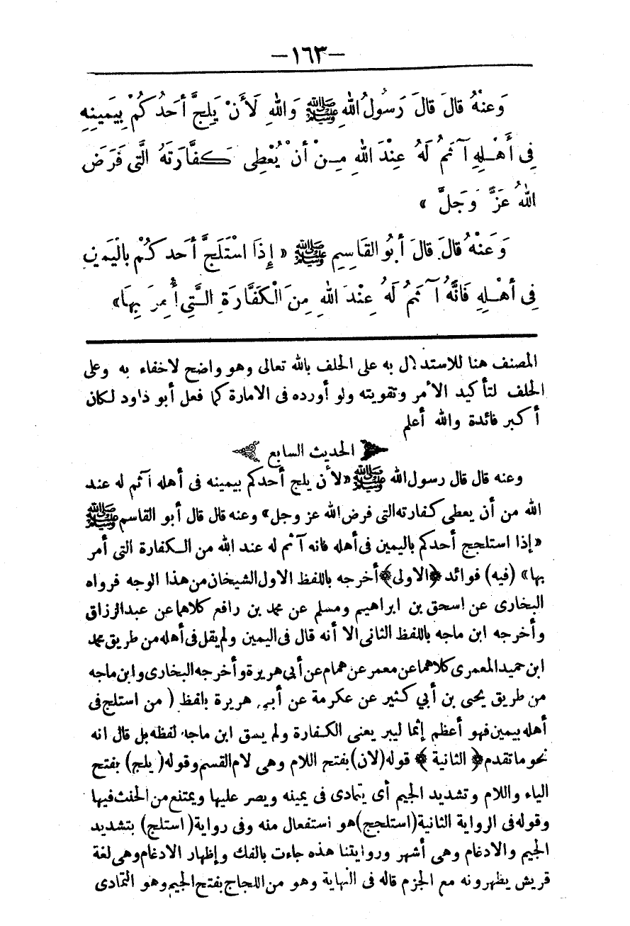 الْحَدِيثُ السَّابِعُ وَعَنْهُ قَالَ قَالَ رَسُولُ اللَّهِ - صَلَّى اللَّهُ عَلَيْهِ وَسَلَّمَ - «لَأَنْ يَلَجَّ أَحَدُكُمْ بِيَمِينِهِ فِي أَهْلِهِ آثَمُ لَهُ عِنْدَ اللَّهِ مِنْ أَنْ يُعْطِيَ كَفَّارَتَهُ الَّتِي فَرَضَ اللَّهُ عَزَّ وَجَلَّ» ، وَعَنْهُ قَالَ قَالَ أَبُو الْقَاسِمِ - صَلَّى اللَّهُ عَلَيْهِ وَسَلَّمَ - «إذَا اسْتَلْجَجَ أَحَدُكُمْ بِالْيَمِينِ فِي أَهْلِهِ فَإِنَّهُ آثَمُ لَهُ عِنْدَ اللَّهِ مِنْ الْكَفَّارَةِ الَّتِي أُمِرَ بِهَا» (فِيهِ) فَوَائِدُ.