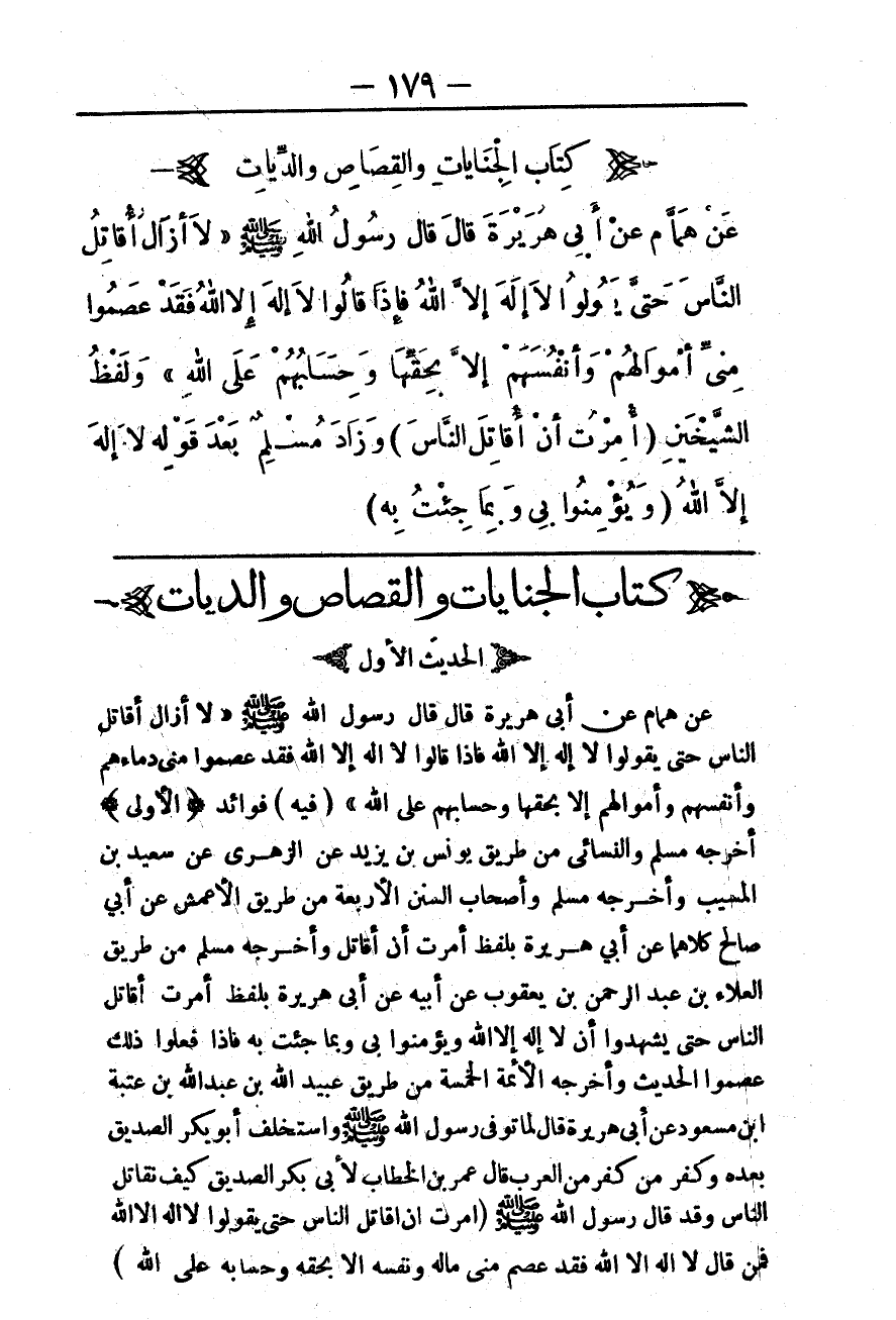 كِتَابُ الْجِنَايَاتِ وَالْقِصَاصِ وَالدِّيَاتِ عَنْ هَمَّامٍ عَنْ أَبِي هُرَيْرَةَ قَالَ قَالَ رَسُولُ اللَّهِ - صَلَّى اللَّهُ عَلَيْهِ وَسَلَّمَ - «لَا أَزَالُ أُقَاتِلُ النَّاسَ حَتَّى يَقُولُوا لَا إلَهَ إلَّا اللَّهُ فَإِذَا قَالُوا لَا إلَهَ إلَّا اللَّهُ فَقَدْ عَصَمُوا مِنِّي أَمْوَالَهُمْ وَأَنْفُسَهُمْ إلَّا بِحَقِّهَا، وَحِسَابُهُمْ عَلَى اللَّهِ» ، وَلَفْظُ الشَّيْخَيْنِ «أُمِرْت أَنْ أُقَاتِلَ النَّاسَ» ، وَزَادَ مُسْلِمٌ بَعْدَ قَوْلِهِ لَا إلَهَ إلَّا اللَّهُ «وَيُؤْمِنُوا بِي وَبِمَا جِئْت بِهِ» ..