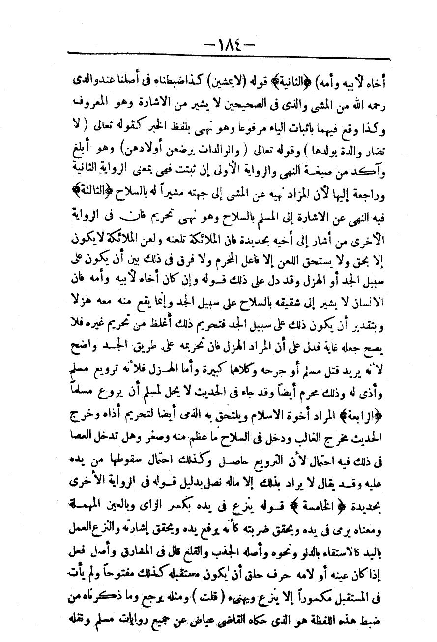 (الثَّانِيَةُ) قَوْلُهُ (لَا يَمْشِيَنَّ) كَذَا ضَبَطْنَاهُ فِي أَصْلِنَا عِنْدَ وَالِدِي - رَحِمَهُ اللَّهُ - مِنْ الْمَشْيِ، وَاَلَّذِي فِي الصَّحِيحَيْنِ لَا يُشِيرُ مِنْ الْإِشَارَةِ، وَهُوَ الْمَعْرُوفُ، وَكَذَا وَقَعَ فِيهِمَا بِإِثْبَاتِ الْيَاءِ مَرْفُوعًا، وَهُوَ نَهْيٌ بِلَفْظِ الْخَبَرِ كَقَوْلِهِ تَعَالَى {لا تُضَارَّ وَالِدَةٌ بِوَلَدِهَا} [البقرة: 233] وقَوْله تَعَالَى {وَالْوَالِدَاتُ يُرْضِعْنَ أَوْلادَهُنَّ} [البقرة: 233] ، وَهُوَ أَبْلَغُ وَآكَدُ مِنْ صِيغَةِ النَّهْيِ، وَالرِّوَايَةُ الْأُولَى إنْ ثَبَتَتْ فَهِيَ بِمَعْنَى الرِّوَايَةِ الثَّانِيَةِ، وَرَاجِعَةٌ إلَيْهَا لِأَنَّ الْمُرَادَ نَهْيُهُ عَنْ الْمَشْيِ إلَى جِهَتِهِ مُشِيرًا لَهُ بِالسِّلَاحِ.