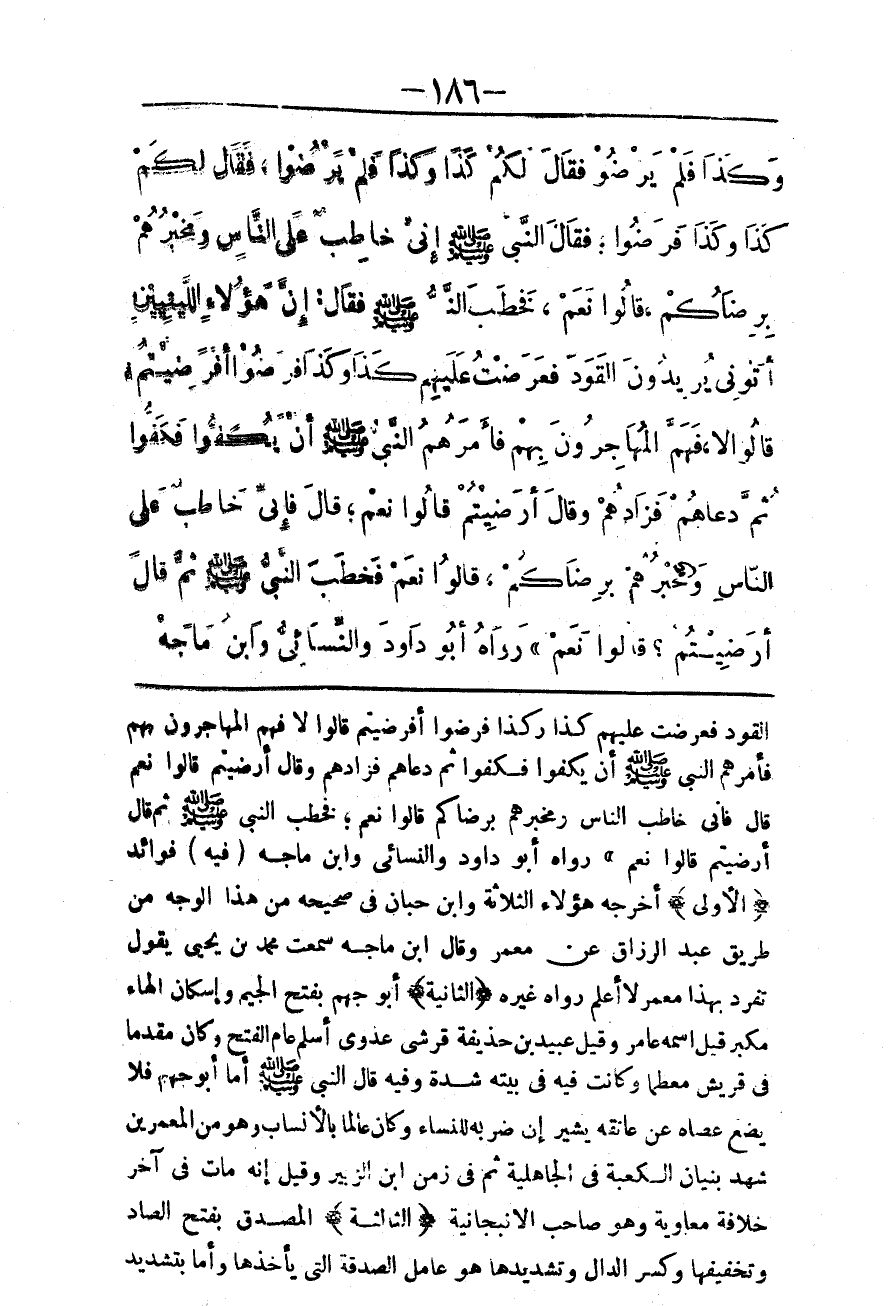 وَكَذَا فَلَمْ يَرْضَوْا فَقَالَ لَكُمْ كَذَا وَكَذَا فَلَمْ يَرْضَوْا، فَقَالَ لَكُمْ كَذَا وَكَذَا فَرَضُوا: فَقَالَ النَّبِيُّ - صَلَّى اللَّهُ عَلَيْهِ وَسَلَّمَ - إنِّي خَاطِبٌ عَلَى النَّاسِ وَمُخْبِرُهُمْ بِرِضَاكُمْ، قَالُوا نَعَمْ، فَخَطَبَ النَّبِيُّ - صَلَّى اللَّهُ عَلَيْهِ وَسَلَّمَ - فَقَالَ: إنَّ هَؤُلَاءِ اللَّيْثِيِّينَ أَتَوْنِي يُرِيدُونَ الْقَوَدَ فَعَرَضْت عَلَيْهِمْ كَذَا وَكَذَا فَرَضُوا أَفَرَضِيتُمْ، قَالُوا لَا، فَهَمَّ الْمُهَاجِرُونَ بِهِمْ فَأَمَرَهُمْ النَّبِيُّ - صَلَّى اللَّهُ عَلَيْهِ وَسَلَّمَ - أَنْ يَكُفُّوا فَكَفُّوا ثُمَّ دَعَاهُمْ فَزَادَهُمْ، وَقَالَ أَرَضِيتُمْ قَالُوا نَعَمْ؛ قَالَ فَإِنِّي خَاطِبٌ عَلَى النَّاسِ، وَمُخْبِرُهُمْ بِرِضَاكُمْ، قَالُوا نَعَمْ فَخَطَبَ النَّبِيُّ - صَلَّى اللَّهُ عَلَيْهِ وَسَلَّمَ - ثُمَّ قَالَ أَرَضِيتُمْ؟ قَالُوا نَعَمْ» رَوَاهُ أَبُو دَاوُد، وَالنَّسَائِيُّ، وَابْنُ مَاجَهْ.