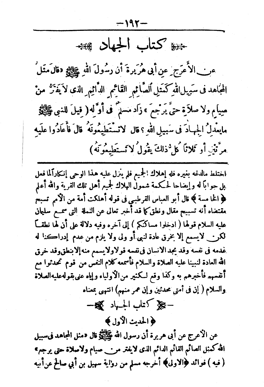 (كِتَابُ الْجِهَادِ) عَنْ الْأَعْرَجِ عَنْ أَبِي هُرَيْرَةَ أَنَّ رَسُولَ اللَّهِ - صَلَّى اللَّهُ عَلَيْهِ وَسَلَّمَ - قَالَ «مَثَلُ الْمُجَاهِدِ فِي سَبِيلِ اللَّهِ كَمَثَلِ الصَّائِمِ الْقَائِمِ الدَّائِمِ الَّذِي لَا يَفْتُرُ مِنْ صِيَامٍ، وَلَا صَلَاةٍ حَتَّى يَرْجِعَ» زَادَ مُسْلِمٌ فِي أَوَّلِهِ «قِيلَ لِلنَّبِيِّ - صَلَّى اللَّهُ عَلَيْهِ وَسَلَّمَ - مَا يَعْدِلُ الْجِهَادَ فِي سَبِيلِ اللَّهِ؟ قَالَ لَا تَسْتَطِيعُونَهُ قَالَ فَأَعَادُوا عَلَيْهِ مَرَّتَيْنِ أَوْ ثَلَاثًا كُلُّ ذَلِكَ يَقُول لَا تَسْتَطِيعُونَهُ» .