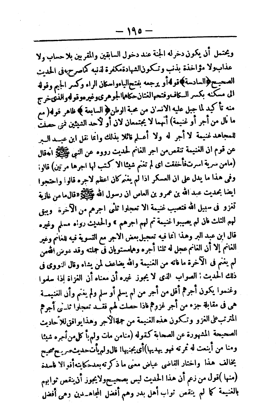 (السَّابِعَةُ) ظَاهِرُ قَوْلِهِ «مَعَ مَا نَالَ مِنْ أَجْرٍ أَوْ غَنِيمَةٍ» أَنَّهُمَا لَا يَجْتَمِعَانِ لِأَنَّ أَوْ لِأَحَدِ الشَّيْئَيْنِ فَمَتَى حَصَلَتْ لِلْمُجَاهِدِ غَنِيمَةٌ لَا أَجْرَ لَهُ، وَلَا أَعْلَمُ قَائِلًا بِذَلِكَ، وَإِنَّمَا نَقَلَ ابْنُ عَبْدِ الْبَرِّ عَنْ قَوْمٍ أَنَّ الْغَنِيمَةَ تُنْقِصُ مِنْ أَجْرِ الْغَانِمِ لِحَدِيثٍ رَوَوْهُ عَنْ النَّبِيِّ - صَلَّى اللَّهُ عَلَيْهِ وَسَلَّمَ - أَنَّهُ قَالَ «مَا مِنْ سَرِيَّةٍ أَسَرَتْ فَأَخْفَقَتْ أَيْ لَمْ تَغْنَمْ شَيْئًا إلَّا كُتِبَ لَهَا أَجْرُهَا مَرَّتَيْنِ» قَالُوا وَفِي هَذَا مَا يَدُلُّ عَلَى أَنَّ الْعَسْكَرَ إذَا لَمْ يَغْنَمْ كَانَ أَعْظَمَ لِأَجْرِهِ، قَالُوا وَاحْتَجُّوا أَيْضًا بِحَدِيثِ عَبْدِ اللَّهِ بْنِ عَمْرِو بْنِ الْعَاصِ أَنَّ رَسُولَ اللَّهِ - صَلَّى اللَّهُ عَلَيْهِ وَسَلَّمَ - قَالَ «مَا مِنْ غَازِيَةٍ تَغْزُو فِي سَبِيلِ اللَّهِ فَتُصِيبُ غَنِيمَةً إلَّا تَعَجَّلُوا ثُلُثَيْ أَجْرِهِمْ مِنْ الْآخِرَةِ، وَيَبْقَى لَهُمْ الثُّلُثُ فَإِنْ لَمْ يُصِيبُوا غَنِيمَةً تَمَّ لَهُمْ أَجْرُهُمْ» ، وَالْحَدِيثُ رَوَاهُ مُسْلِمٌ، وَغَيْرُهُ قَالَ ابْنُ عَبْدِ الْبَرِّ، وَهَذَا إنَّمَا فِيهِ تَعْجِيلُ بَعْضِ الْأَجْرِ مَعَ التَّسْوِيَةِ فِيهِ لِلْغَانِمِ وَغَيْرِ الْغَانِمِ إلَّا أَنَّ الْغَانِمَ عُجِّلَ لَهُ ثُلُثَا أَجْرِهِ، وَهُمَا مُسْتَوِيَانِ فِي جُمْلَتِهِ، وَقَدْ عَوَّضَ اللَّهُ مَنْ لَمْ يَغْنَمْ فِي الْآخِرَةِ مَا فَاتَهُ مِنْ الْغَنِيمَةِ، وَاَللَّهُ يُضَاعِفُ لِمَنْ يَشَاءُ، وَقَالَ النَّوَوِيُّ فِي ذَلِكَ الْحَدِيثِ: الصَّوَابُ الَّذِي لَا يَجُوزُ غَيْرُهُ أَنَّ مَعْنَاهُ أَنَّ الْغُزَاةَ إذَا سَلِمُوا وَغَنِمُوا يَكُونُ أَجْرُهُمْ أَقَلَّ مِنْ أَجْرِ مَنْ لَمْ يَسْلَمْ، أَوْ سَلِمَ وَلَمْ يَغْنَمْ، وَأَنَّ الْغَنِيمَةَ هِيَ فِي مُقَابَلَةِ جُزْءٍ مِنْ أَجْرِ غَزْوِهِمْ فَإِذَا حَصَلَتْ لَهُمْ فَقَدْ تَعَجَّلُوا ثُلُثَيْ أَجْرِهِمْ الْمُتَرَتِّبِ عَلَى الْغَزْوِ، وَتَكُونُ هَذِهِ الْغَنِيمَةُ مِنْ جُمْلَةِ الْأَجْرِ، وَهَذَا يُوَافِقُ لِلْأَحَادِيثِ الصَّحِيحَةِ الْمَشْهُورَةِ عَنْ الصَّحَابَةِ كَقَوْلِهِ «مِنَّا مَنْ مَاتَ، وَلَمْ يَأْكُلْ مِنْ أَجْرِهِ شَيْئًا، وَمِنَّا مَنْ أَيْنَعَتْ لَهُ ثَمَرَتُهُ فَهُوَ يَهْدَبُهَا» أَيْ يَجْنِيهَا، قَالَ: وَلَمْ يَأْتِ حَدِيثٌ صَرِيحٌ صَحِيحٌ يُخَالِفُ هَذَا، وَاخْتَارَ الْقَاضِي عِيَاضٌ مَعْنَى مَا ذَكَرْته بَعْدَ حِكَايَتِهِ أَقْوَالًا فَاسِدَةً (مِنْهَا) قَوْلُ مَنْ زَعَمَ أَنَّ هَذَا الْحَدِيثَ لَيْسَ بِصَحِيحٍ، وَلَا يَجُوزُ أَنْ يُنْقَصَ ثَوَابُهُمْ بِالْغَنِيمَةِ كَمَا لَمْ يُنْقَصُ ثَوَابُ أَهْلِ بَدْرٍ، وَهُمْ أَفْضَلُ الْمُجَاهِدِينَ، وَهِيَ أَفْضَلُ