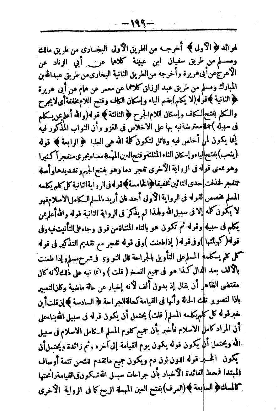 (الْخَامِسَةُ) قَوْلُهُ فِي الرِّوَايَةِ الثَّانِيَةِ كُلُّ كَلْمٍ يُكْلَمُهُ الْمُسْلِمُ مُخَصِّصٌ لِقَوْلِهِ فِي الرِّوَايَةِ الْأُولَى أَحَدٌ فَإِنْ أُرِيدَ بِالْمُسْلِمِ الْكَامِلُ الْإِسْلَامِ فَهُوَ لَا يَكُونُ كَلْمُهُ إلَّا فِي سَبِيلِ اللَّهِ، وَلِهَذَا لَمْ يَذْكُرْ فِي الرِّوَايَةِ الثَّانِيَةِ قَوْلَهُ وَاَللَّهُ أَعْلَمُ بِمَنْ يُكْلَمُ فِي سَبِيلِهِ، وَقَوْلُهُ ثُمَّ تَكُونُ هُوَ بِالتَّاءِ الْمُثَنَّاةِ مِنْ فَوْقُ، وَجَاءَ عَلَى التَّأْنِيثِ فِيهِ، وَفِي قَوْلِهِ (كَهَيْئَتِهَا) وَفِي قَوْلِهِ (إذَا طُعِنَتْ) وَفِي قَوْلِهِ تَفَجَّرُ مَعَ تَقْدِيمِ التَّذْكِيرِ فِي قَوْلِهِ كُلُّ كَلْمٍ يُكْلَمُهُ الْمُسْلِمُ عَلَى التَّأْوِيلِ بِالْجِرَاحَةِ قَالَ النَّوَوِيُّ فِي شَرْحِ مُسْلِمٍ وَإِذَا طُعِنَتْ بِالْأَلِفِ بَعْدَ الدَّالِ كَذَا هُوَ فِي جَمِيعِ النُّسَخِ (قُلْت) وَإِنَّمَا نَبَّهَ عَلَى ذَلِكَ لِأَنَّهُ كَانَ مُقْتَضَى الظَّاهِرِ أَنْ يُقَالَ إذْ بِدُونِ أَلِفٍ لِأَنَّهُ إخْبَارٌ عَنْ حَالَةٍ مَاضِيَةٍ، وَكَانَ التَّعْبِيرُ بِإِذَا لِتَصْوِيرِ تِلْكَ الْحَالَةِ، وَأَنَّهَا فِي الْقِيَامَةِ كَحَالَةِ الْجِرَاحَةِ.