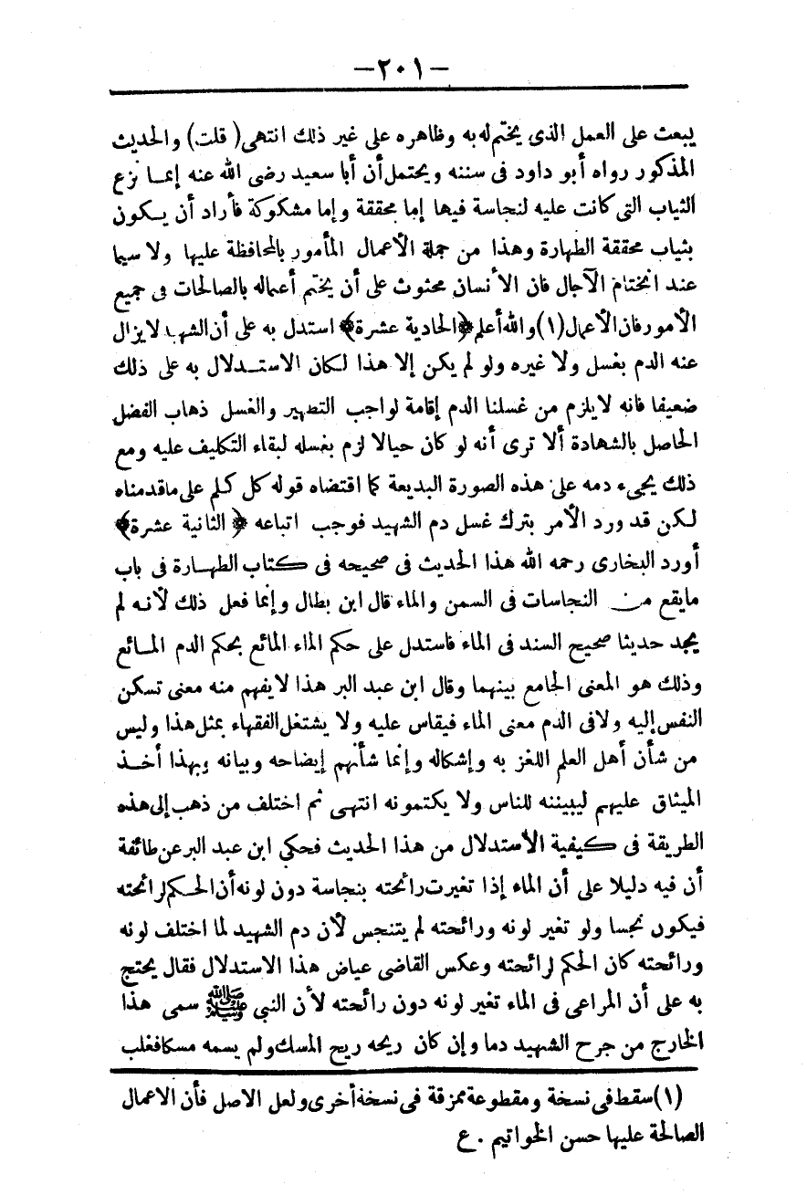 {الثَّانِيَةَ عَشْرَةَ} أَوْرَدَ الْبُخَارِيُّ - رَحِمَهُ اللَّهُ - هَذَا الْحَدِيثَ فِي صَحِيحِهِ فِي كِتَابِ الطَّهَارَةِ فِي بَابِ مَا يَقَعُ مِنْ النَّجَاسَاتِ فِي السَّمْنِ وَالْمَاءِ قَالَ ابْنُ بَطَّالٍ، وَإِنَّمَا فَعَلَ ذَلِكَ لِأَنَّهُ لَمْ يَجِدْ حَدِيثًا صَحِيحَ السَّنَدِ فِي الْمَاءِ فَاسْتَدَلَّ عَلَى حُكْمِ الْمَاءِ الْمَائِعِ بِحُكْمِ الدَّمِ الْمَائِعِ، وَذَلِكَ هُوَ الْمَعْنَى الْجَامِعُ بَيْنَهُمَا، وَقَالَ ابْنُ عَبْدِ الْبَرِّ هَذَا لَا يُفْهَمُ مِنْهُ مَعْنًى تَسْكُنُ النَّفْسُ إلَيْهِ، وَلَا فِي الدَّمِ مَعْنَى الْمَاءِ فَيُقَاسُ عَلَيْهِ، وَلَا يَشْتَغِلُ الْفُقَهَاءُ بِمِثْلِ هَذَا وَلَيْسَ مِنْ شَأْنِ أَهْلِ الْعِلْمِ اللُّغْزُ بِهِ، وَإِشْكَالُهُ، وَإِنَّمَا شَأْنُهُمْ إيضَاحُهُ وَبَيَانُهُ، وَبِهَذَا أُخِذَ الْمِيثَاقُ عَلَيْهِمْ لَيُبَيِّنُنَّهُ لِلنَّاسِ، وَلَا يَكْتُمُونَهُ انْتَهَى ثُمَّ اخْتَلَفَ مَنْ ذَهَبَ إلَى هَذِهِ الطَّرِيقَةِ فِي كَيْفِيَّةِ الِاسْتِدْلَالِ مِنْ هَذَا الْحَدِيثِ فَحَكَى ابْنُ عَبْدِ الْبَرِّ عَنْ طَائِفَةٍ أَنَّ فِيهِ دَلِيلًا عَلَى أَنَّ الْمَاءَ إذَا تَغَيَّرَتْ رَائِحَتُهُ بِنَجَاسَةٍ دُونَ لَوْنِهِ أَنَّ الْحُكْمَ لِرَائِحَتِهِ فَيَكُونُ نَجِسًا، وَلَوْ تَغَيَّرَ لَوْنُهُ وَرَائِحَتُهُ لَمْ يَتَنَجَّسْ لِأَنَّ دَمَ الشَّهِيدِ لَمَّا اخْتَلَفَ لَوْنُهُ وَرَائِحَتُهُ كَانَ الْحُكْمُ لِرَائِحَتِهِ، وَعَكَسَ الْقَاضِي عِيَاضٌ هَذَا الِاسْتِدْلَالَ فَقَالَ يُحْتَجُّ بِهِ عَلَى أَنَّ الْمُرَاعَى فِي الْمَاءِ تَغَيُّرُ لَوْنِهِ دُونَ رَائِحَتِهِ لِأَنَّ النَّبِيَّ - صَلَّى اللَّهُ عَلَيْهِ وَسَلَّمَ - سَمَّى هَذَا الْخَارِجَ مِنْ جُرْحِ الشَّهِيدِ دَمًا، وَإِنْ كَانَ رِيحُهُ رِيحَ الْمِسْكِ، وَلَمْ يُسَمِّهِ مِسْكًا فَغَلَّبَ