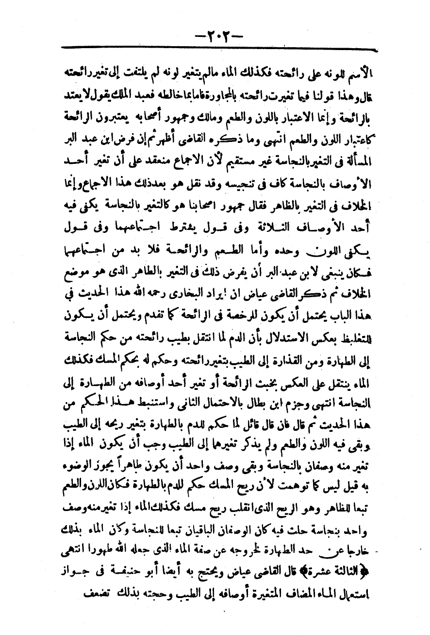 وَمَا ذَكَرَهُ الْقَاضِي أَظْهَرُ ثُمَّ إنَّ فَرْضَ ابْنِ عَبْدِ الْبَرِّ الْمَسْأَلَةَ فِي التَّغَيُّرِ بِالنَّجَاسَةِ غَيْرُ مُسْتَقِيمٍ لِأَنَّ الْإِجْمَاعَ مُنْعَقِدٌ عَلَى أَنَّ تَغَيُّرَ أَحَدِ الْأَوْصَافِ بِالنَّجَاسَةِ كَافٍ فِي تَنْجِيسِهِ، وَقَدْ نَقَلَ هُوَ بَعْدَ ذَلِكَ هَذَا الْإِجْمَاعَ، وَإِنَّمَا الْخِلَافُ فِي التَّغَيُّرِ بِالظَّاهِرِ فَقَالَ جُمْهُورُ أَصْحَابِنَا هُوَ كَالتَّغَيُّرِ بِالنَّجَاسَةِ يَكْفِي فِيهِ أَحَدُ الْأَوْصَافِ الثَّلَاثَةِ، وَفِي قَوْلٍ يُشْتَرَطُ اجْتِمَاعُهُمَا، وَفِي قَوْلٍ يَكْفِي اللَّوْنُ وَحْدَهُ.