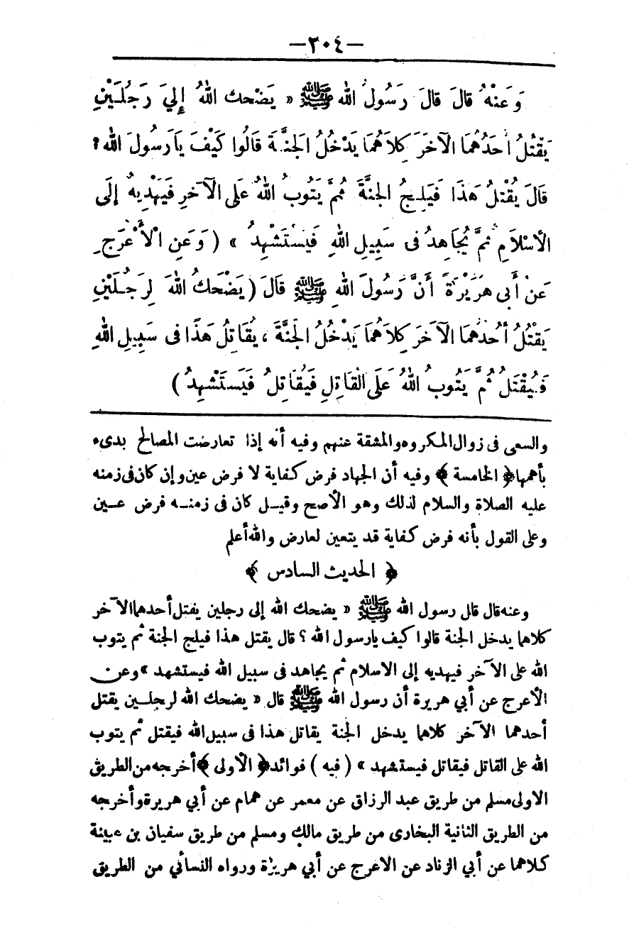 وَعَنْهُ قَالَ رَسُولُ اللَّهِ - صَلَّى اللَّهُ عَلَيْهِ وَسَلَّمَ - «يَضْحَكُ اللَّهُ إلَى رَجُلَيْنِ يَقْتُلُ أَحَدُهُمَا الْآخَرَ كِلَاهُمَا يَدْخُلُ الْجَنَّةَ قَالُوا كَيْفَ يَا رَسُولَ اللَّهِ؟ قَالَ يُقْتَلُ هَذَا فَيَلِجُ الْجَنَّةَ ثُمَّ يَتُوبُ اللَّهُ عَلَى الْآخَرِ فَيَهْدِيه إلَى الْإِسْلَامِ ثُمَّ يُجَاهِدُ فِي سَبِيلِ اللَّهِ فَيُسْتَشْهَدُ» وَعَنْ الْأَعْرَجِ عَنْ أَبِي هُرَيْرَةَ أَنَّ رَسُولَ اللَّهِ - صَلَّى اللَّهُ عَلَيْهِ وَسَلَّمَ - قَالَ «يَضْحَكُ اللَّهُ لِرَجُلَيْنِ يَقْتُلُ أَحَدُهُمَا الْآخَرَ كِلَاهُمَا يَدْخُلُ الْجَنَّةَ يُقَاتِلُ هَذَا فِي سَبِيلِ اللَّهِ فَيُقْتَلُ ثُمَّ يَتُوبُ اللَّهُ عَلَى الْقَاتِلِ فَيُقَاتِلُ فَيُسْتَشْهَدُ» .