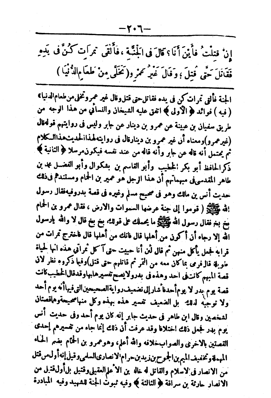وَقَالَ ابْنُ طَاهِرٍ فِي حَدِيثِ جَابِرٍ إنَّهُ كَانَ يَوْمَ أُحُدٍ، وَفِي حَدِيثِ أَنَسٍ يَوْمَ بَدْرٍ فَجَعَلَ ذَلِكَ اخْتِلَافًا، وَقَدْ عَرَفْت أَنَّ ذَلِكَ إنَّمَا جَاءَ مِنْ تَفْسِيرِهِمْ إحْدَى الْقِصَّتَيْنِ بِالْأُخْرَى، وَالصَّوَابُ خِلَافُهُ، وَاَللَّهُ أَعْلَمُ وَهُوَ عَمْرُو بْنُ الْحُمَامِ بِضَمِّ الْحَاءِ الْمُهْمَلَةِ وَتَخْفِيفِ الْمِيمِ ابْنِ الْجَمُوحِ بْنِ زَيْدِ بْنِ حَرَامٍ الْأَنْصَارِيُّ السُّلَمِيُّ، وَقِيلَ إنَّهُ أَوَّلُ مَنْ قُتِلَ مِنْ الْأَنْصَارِ فِي الْإِسْلَامِ، وَالْقَاتِلُ لَهُ خَالِدُ بْنُ الْأَعْلَمِ الْعُقَيْلِيُّ، وَقَتِيلٌ بَلْ أَوَّلُ قَتِيلٍ مِنْ الْأَنْصَارِ حَارِثَةُ بْنُ سُرَاقَةَ.