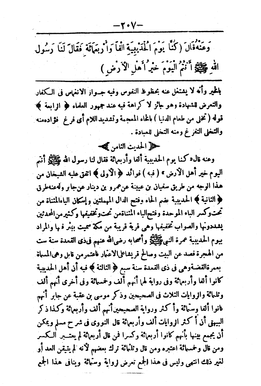 {الثَّالِثَةُ} فِيهِ أَنَّ أَهْلَ الْحُدَيْبِيَةِ كَانُوا أَلْفًا وَأَرْبَعَمِائَةٍ، وَفِي رِوَايَةٍ لَهُمَا أَنَّهُمْ أَلْفٌ وَخَمْسُمِائَةٍ، وَفِي أُخْرَى أَنَّهُمْ أَلْفٌ وَثَلَثُمِائَةٍ، وَالرِّوَايَاتُ الثَّلَاثُ فِي الصَّحِيحَيْنِ، وَذَكَرَ مُوسَى بْنُ عُقْبَةَ عَنْ جَابِرٍ أَنَّهُمْ كَانُوا أَلْفًا، وَسِتِّمِائَةٍ، وَأَكْثَرُ، وَرِوَايَةُ الصَّحِيحَيْنِ أَنَّهُمْ أَلْفٌ وَأَرْبَعُمِائَةٍ وَكَذَا ذَكَرَ الْبَيْهَقِيُّ أَنَّ أَكْثَرَ الرِّوَايَاتِ أَلْفٌ وَأَرْبَعُمِائَةٍ قَالَ النَّوَوِيُّ فِي شَرْحِ مُسْلِمٍ، وَيُمْكِنُ أَنْ يَجْمَعَ بَيْنَهَا بِأَنَّهُمْ كَانُوا أَرْبَعَمِائَةٍ وَكَسْرًا فَمَنْ قَالَ أَرْبَعَمِائَةٍ لَمْ يَعْتَبِرْ الْكَسْرَ وَمَنْ قَالَ وَخَمْسَمِائَةٍ اعْتَبَرَهُ، وَمَنْ قَالَ: وَثَلَثَمِائَةٍ تَرَكَ بَعْضَهُمْ لِأَنَّهُ لَمْ يَتَيَقَّنْ الْعَدَّ أَوْ لِغَيْرِ ذَلِكَ انْتَهَى.